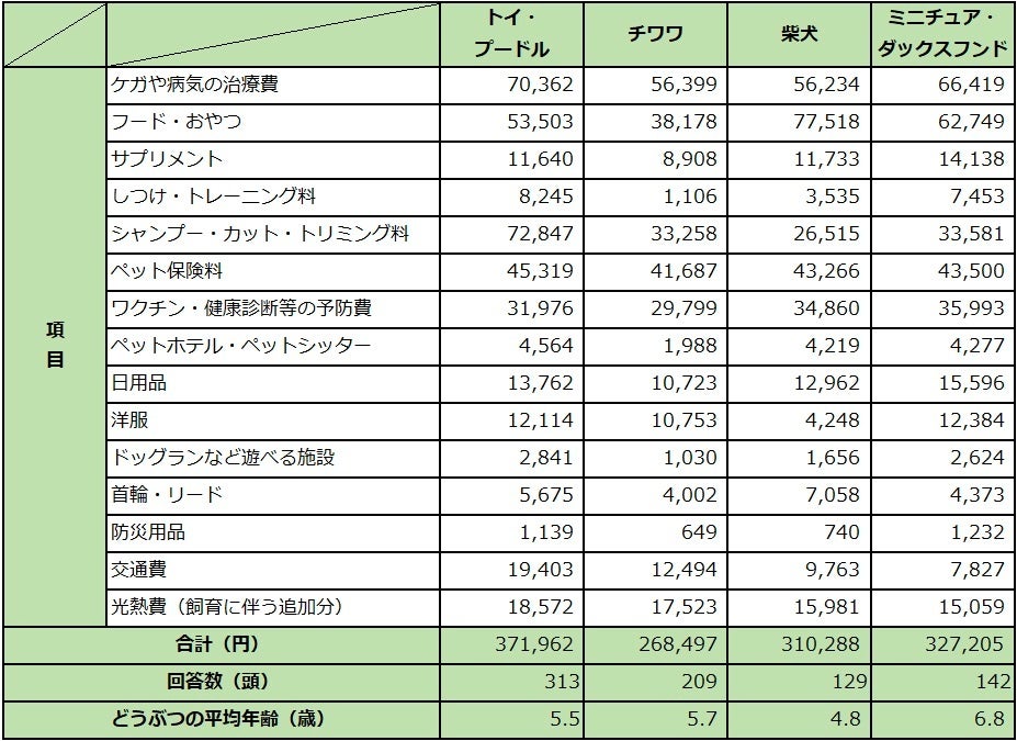 最も合計が高かったのはトイ・プードルの37万円で、全体平均を1万円以上、上回りました。トイ・プードルは、被毛が伸び続けることから定期的なカットが必要なため、「シャンプー・カット・トリミング料」が7.3万円と高額で、「治療費」の7.0万円を上回るとともに、柴犬の2.7万円と比べても3倍近い出費となっています。