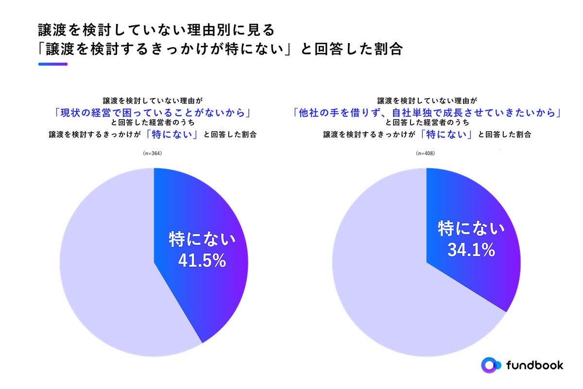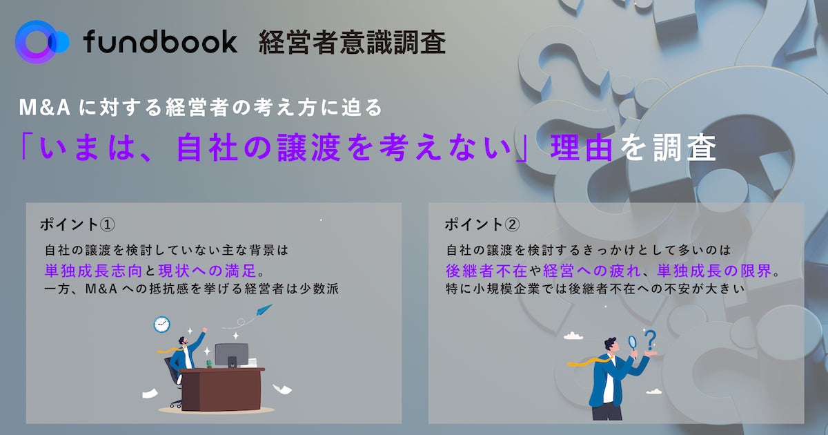 M&A仲介を行う株式会社fundbook(本社:東京都港区、代表取締役: 渡邊和久、読み:ファンドブック、以下「当社」)は、「自社の譲渡を検討していない経営者」を対象に、その背景を探る意識調査を実施しました(対象者数:1,597名)。