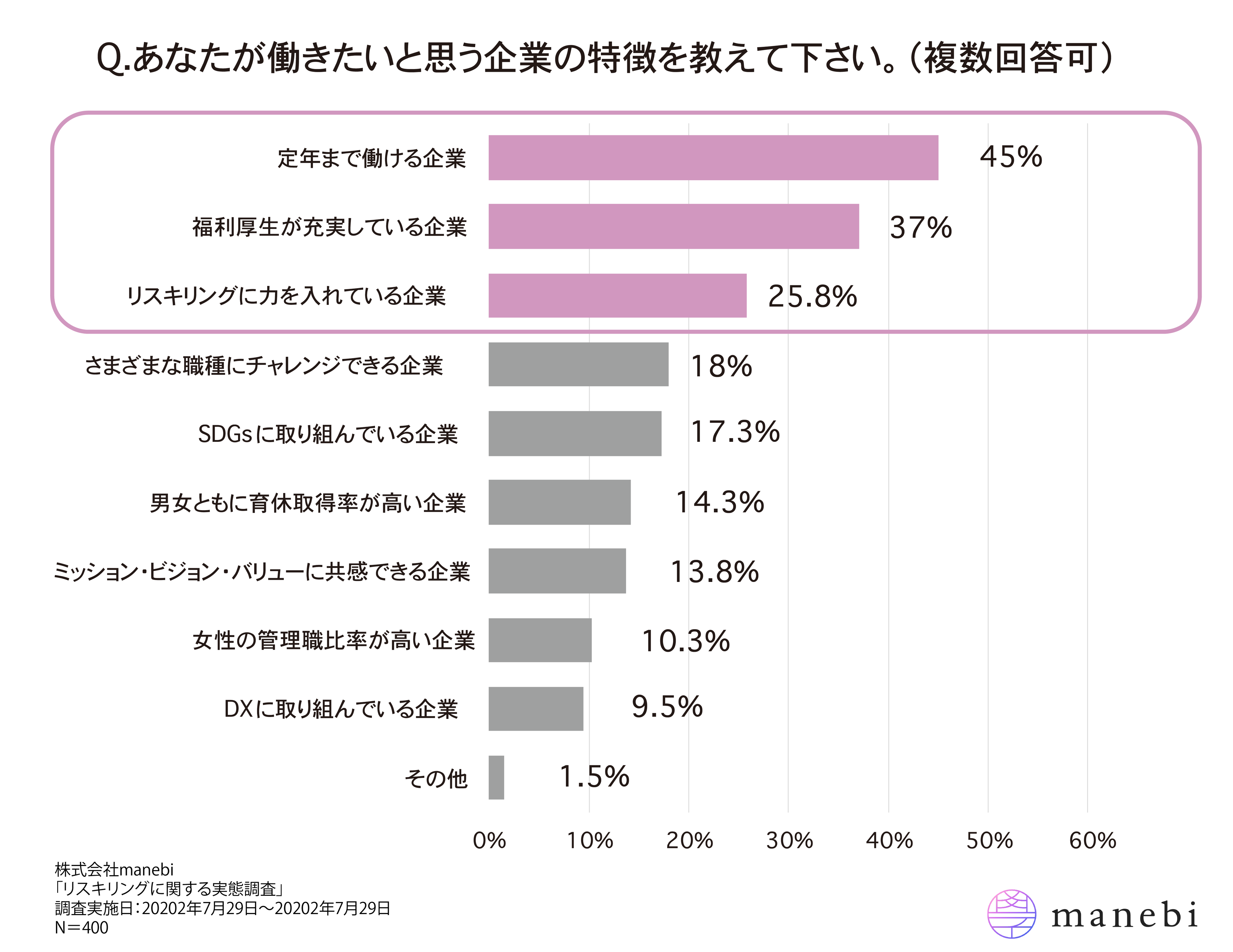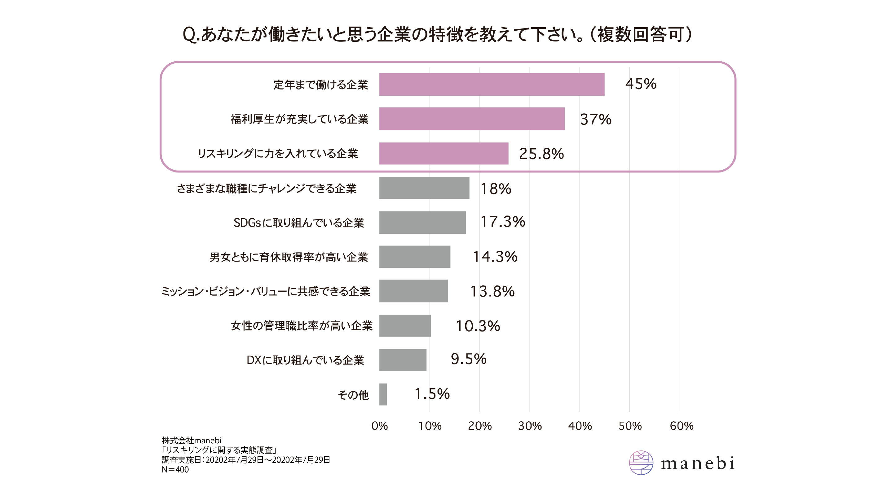 「あなたが働きたいと思う企業の特徴を教えて下さい。(複数回答可)」という質問に対して、1位は「定年まで働ける企業(45%)」、2位は「福利厚生の充実している企業(37%)」、3位は「リスキリングに力を入れている企業(25.8%)」でした。安定的な職場環境に回答が多く集まる中、リスキリングに力を入れている企業も人気がありました。