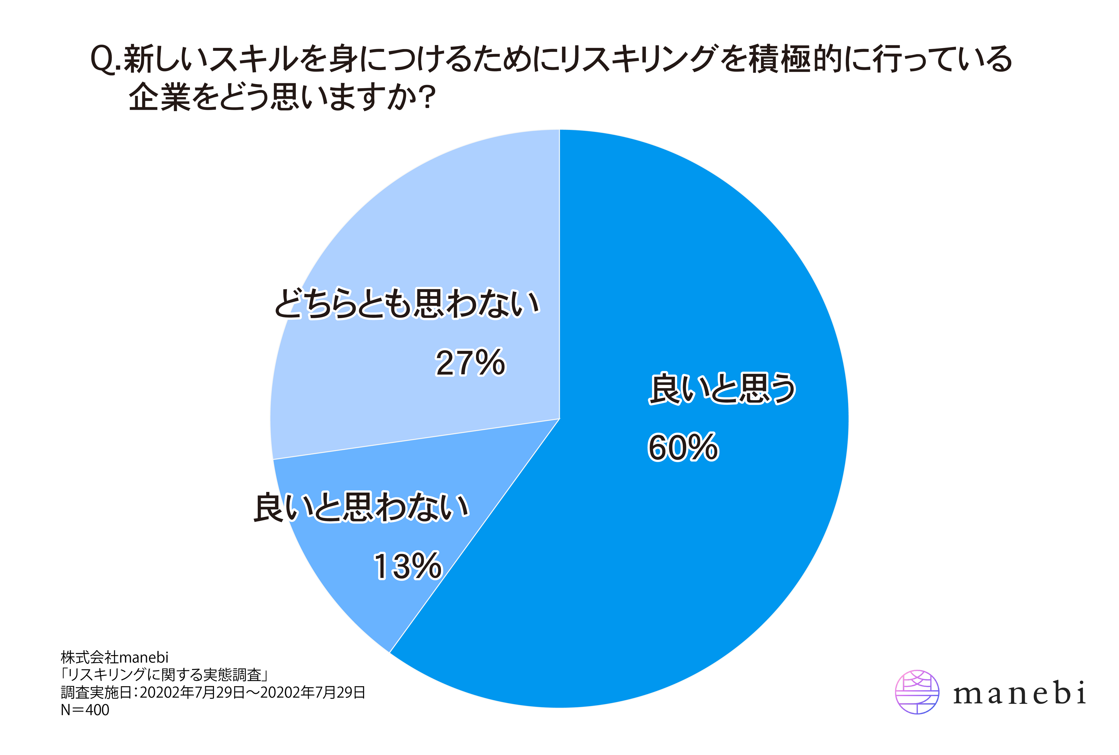 「新しいスキルを身につけるためにリスキリングを積極的に行っている企業をどう思いますか?」という質問には、60%のビジネスパーソンが「いいと思う」と回答。リスキリングに前向きな人が多い傾向にありました。