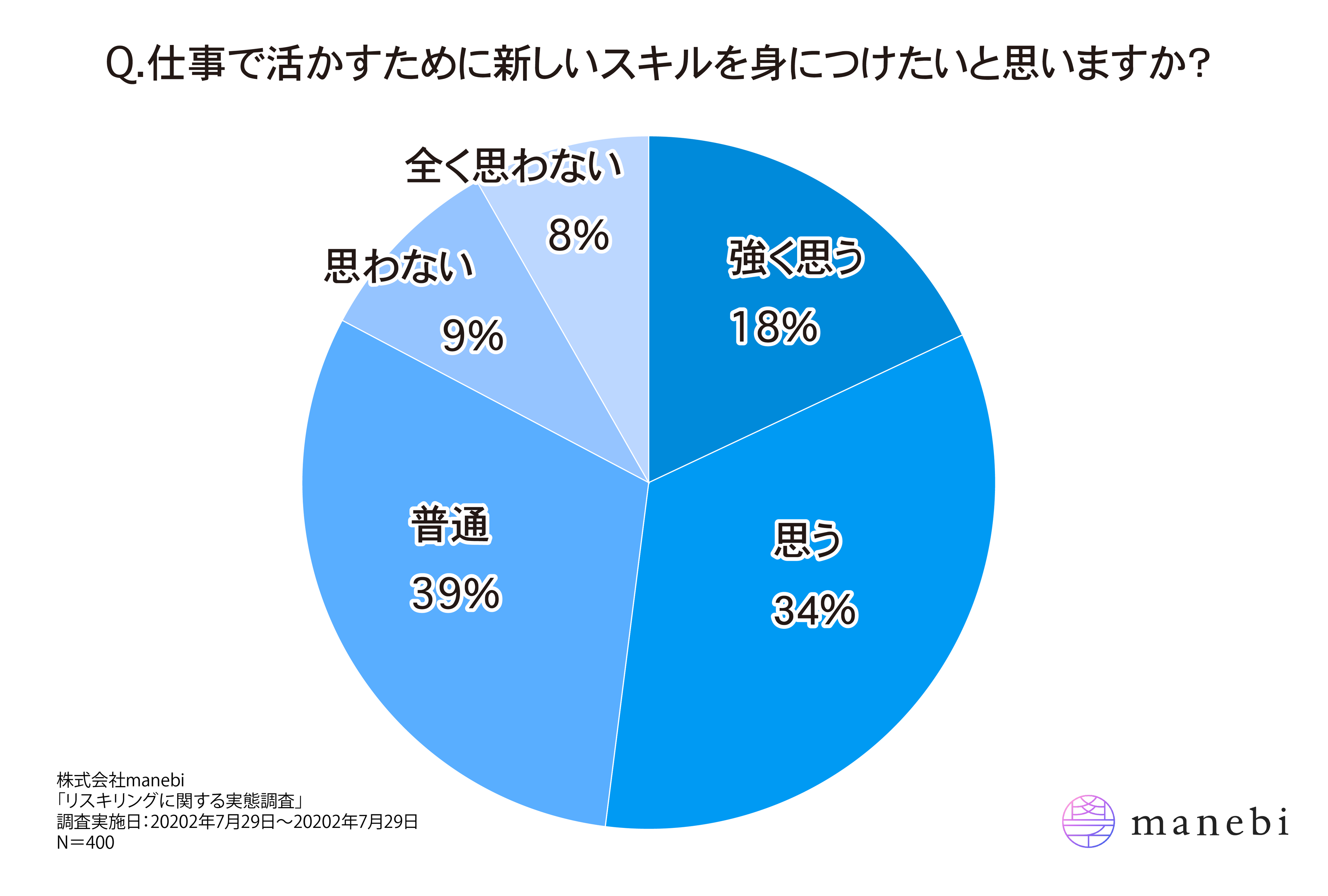 「仕事で活かすために新しいスキルを身につけたいと思いますか?」という質問に「強く思う」が18%、「思う」が34%と、5割以上のビジネスパーソンが新しいスキルを学びたいと回答しました。