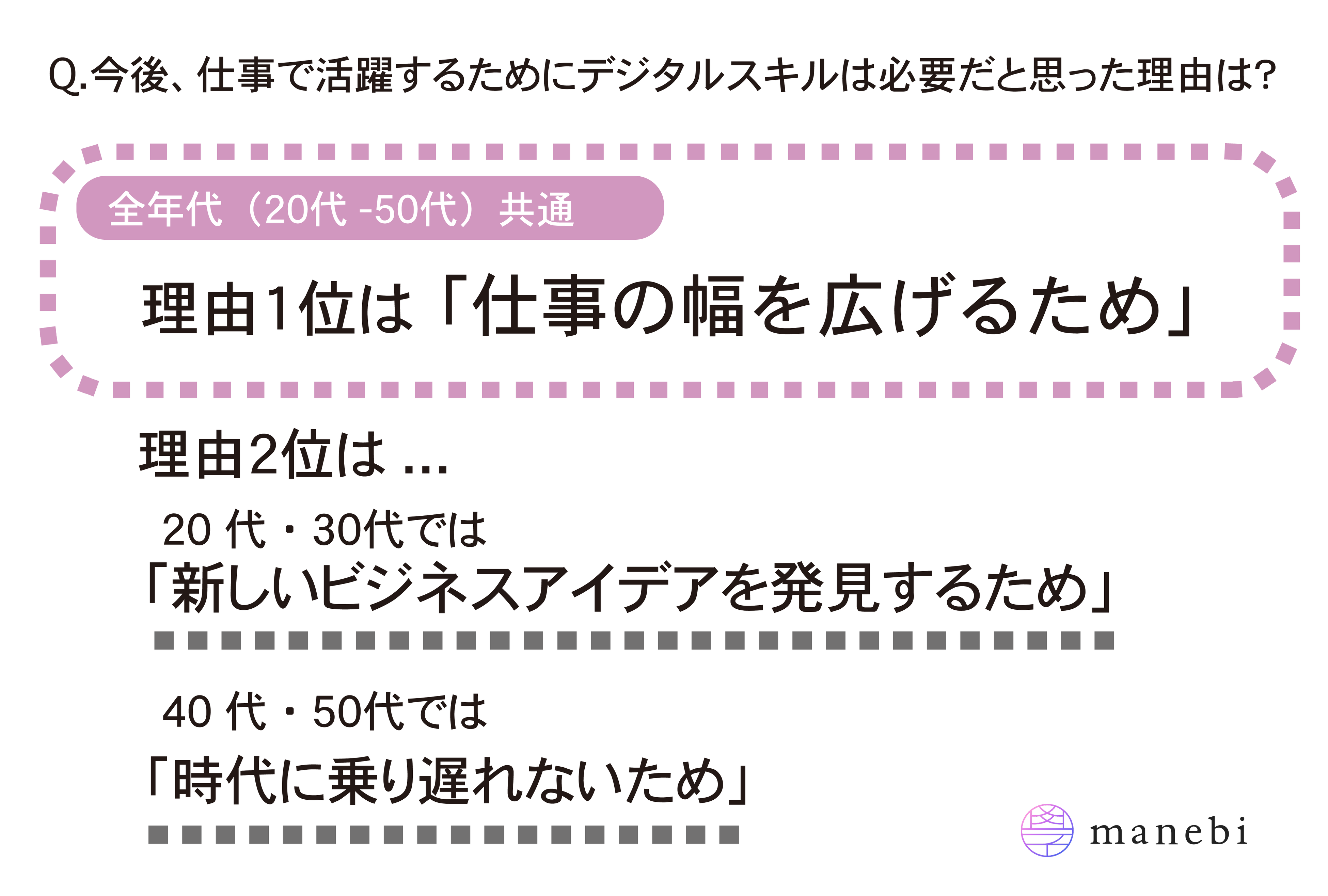 デジタルスキルが必要だと思う理由1位は、全年代共通で「仕事の幅を広げるため」でした。