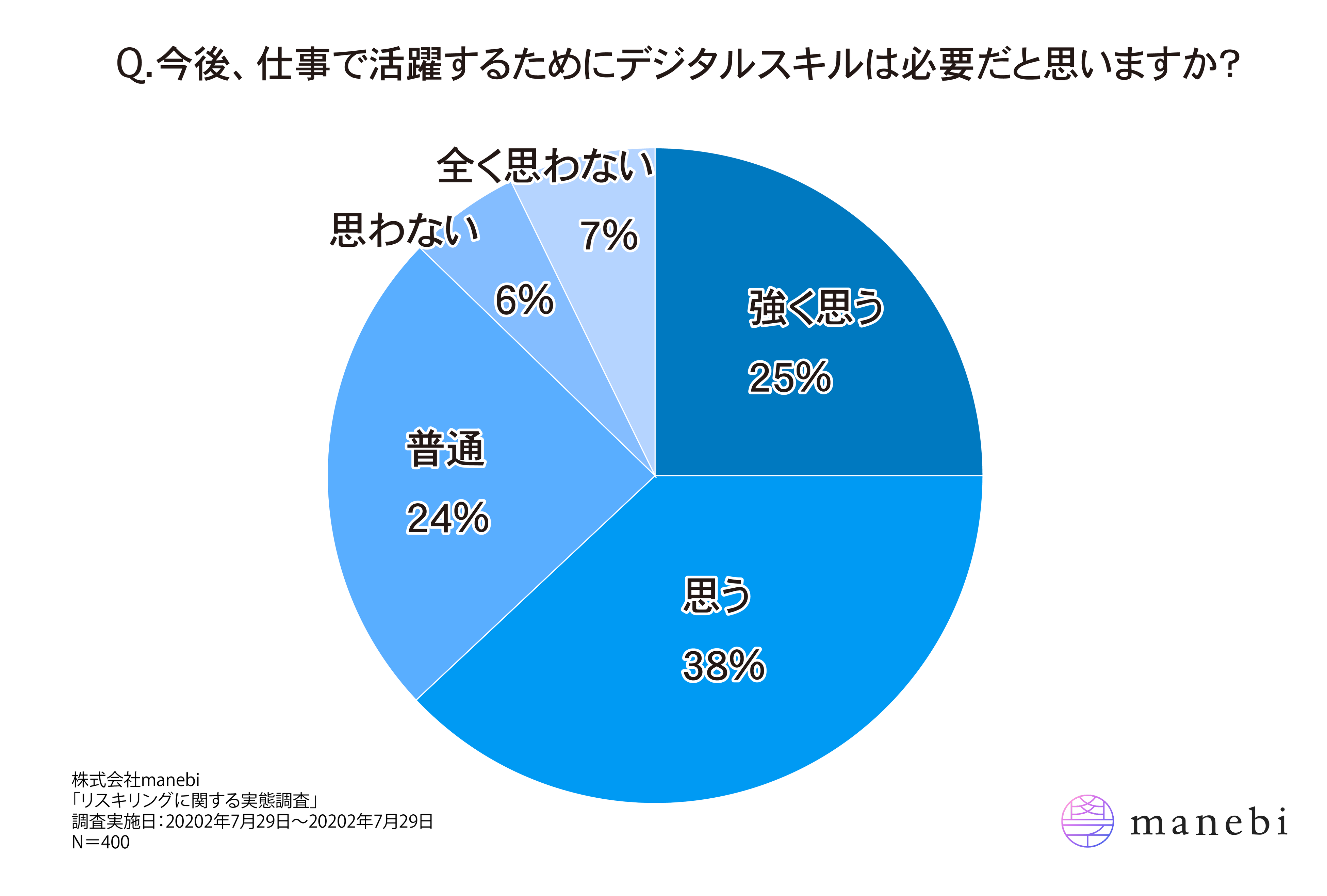 「今後、仕事で活躍するためにデジタルスキルは必要だと思いますか?」という質問に対し「強く思う」は25%、「思う」は35%と、6割のビジネスパーソンがデジタルスキルを学ぶことに前向きな考えを持っていることが分かりました。