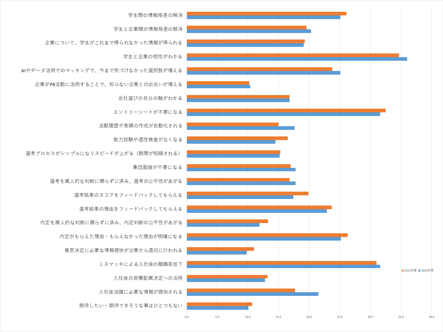 第2回の本調査におけるパーソナルデータ・テクノロジーの利活用では、「手間の改善」「企業とのマッチング向上」「離職率低下」への期待が上位にランクインしたように、 学生からデータ・テクノロジー活用による、よりよい就職活動の変化への期待がこれまでと比べて大きくなっています。