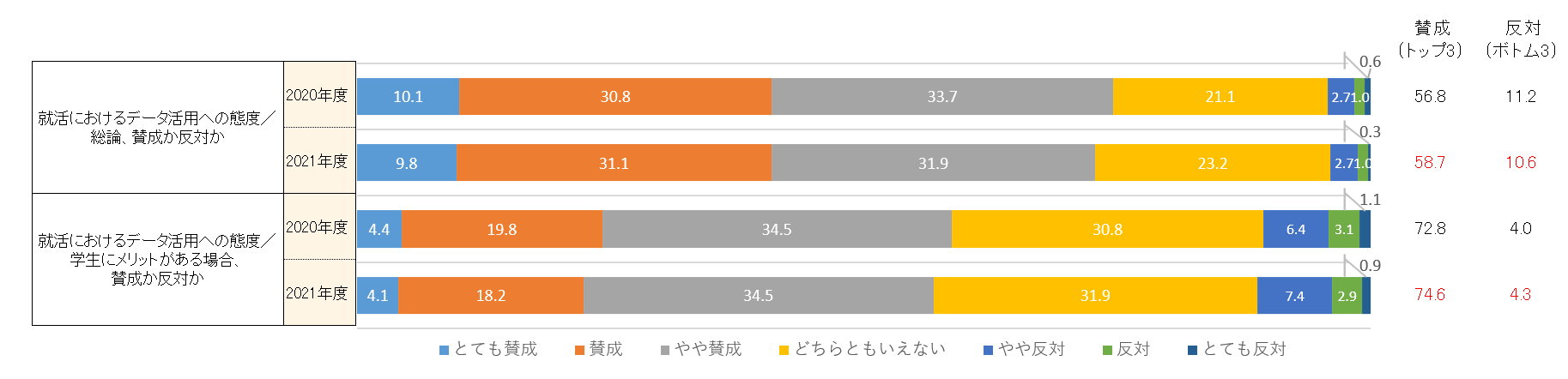 ・全体では、賛成(トップ3ボックス)は2020年度56.8%から2021年度58.7%へ増加、反対(ボトム3ボックス)は2020年度の11.2%から2021年度は10.6%の微減となりました。