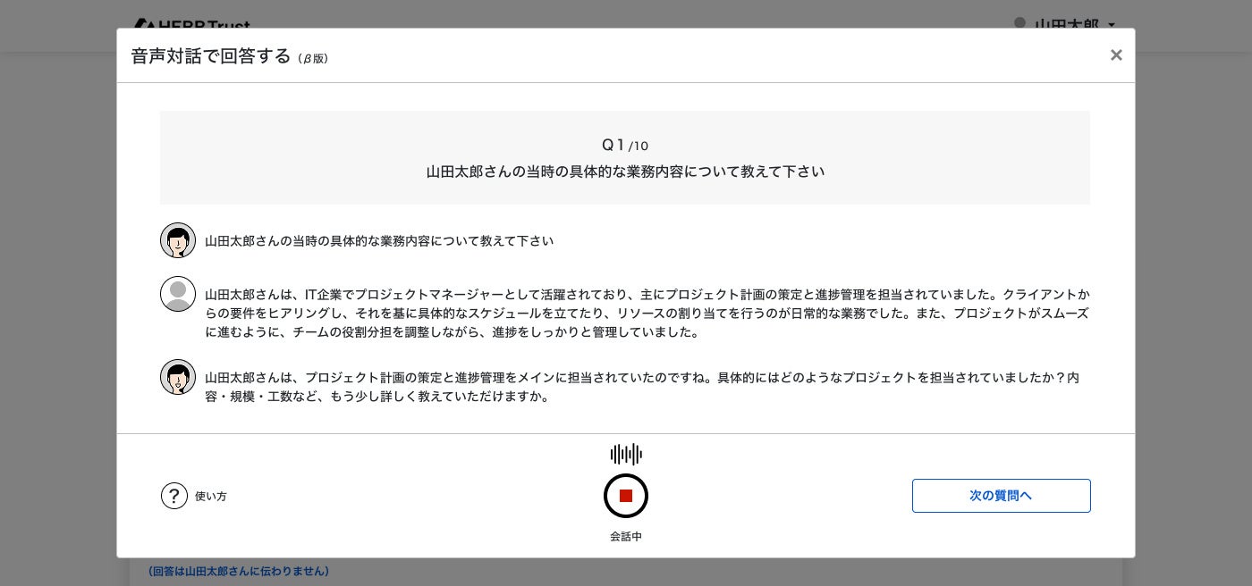 リファレンスチェックの回答画面で「音声対話で回答する」を選択することで、対話型AIエージェントの質問に音声で回答することができます。対話内容に応じてAIが追加質問を行うため、必要な情報を簡単に取得することが可能です。回答完了後、回答のテキストを自動で作成・校閲し、必要に応じて手動で追記や修正を行うことができます。
