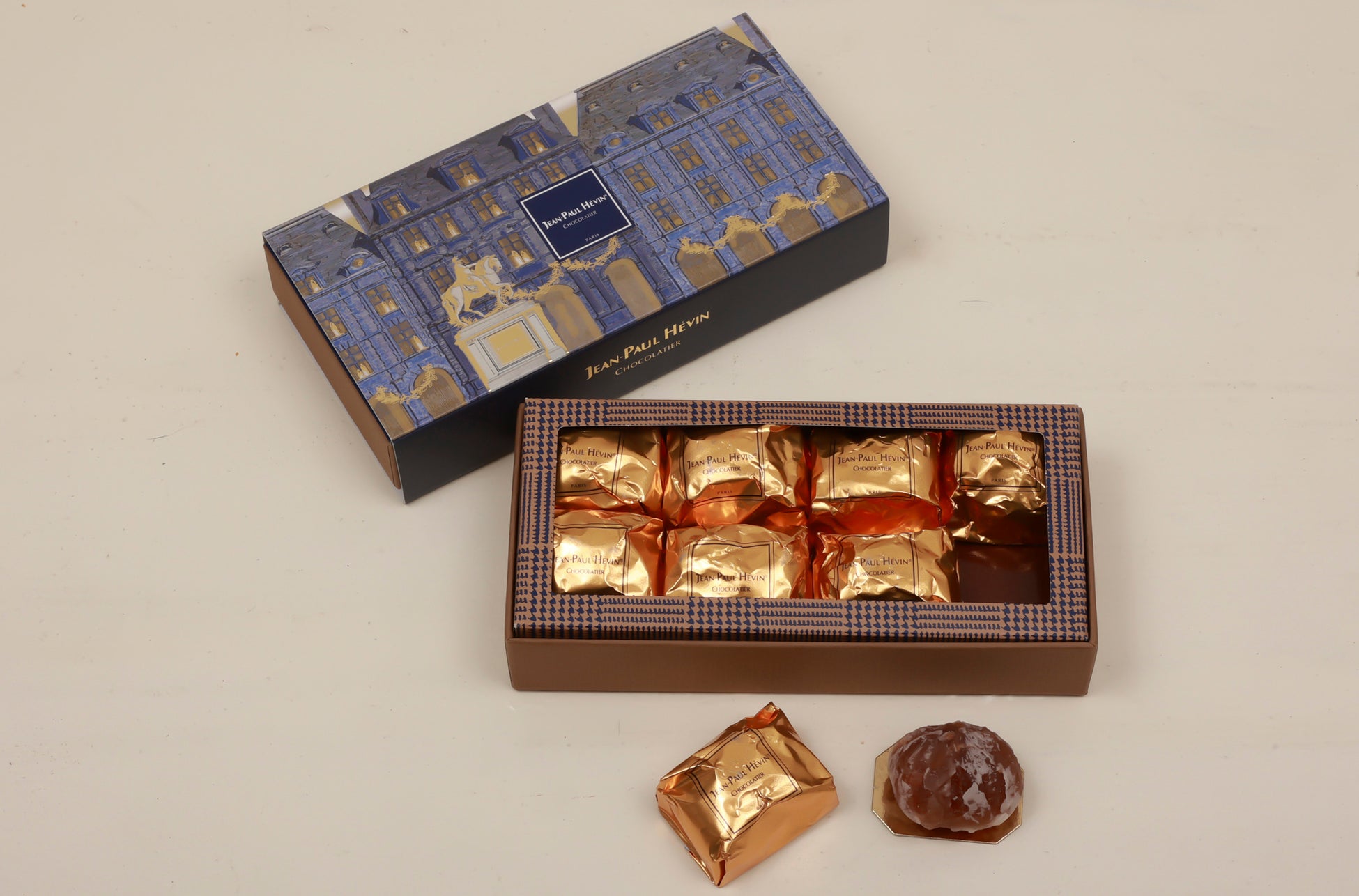 ヴォージュ広場をイメージした季節限定スリーブ付き。季節限定の「マロン グラッセ」6個と、ノエル限定ショコラを含むボンボン ショコラ20個の詰合せ。