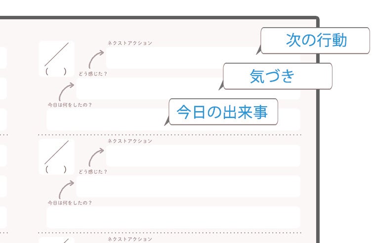 →気づいたその場で3STEP日記へファクト→分析→ネクストアクションを記入します。そうすることで気づきが時系列で整理され、読み返す・振り返る作業が楽になります。