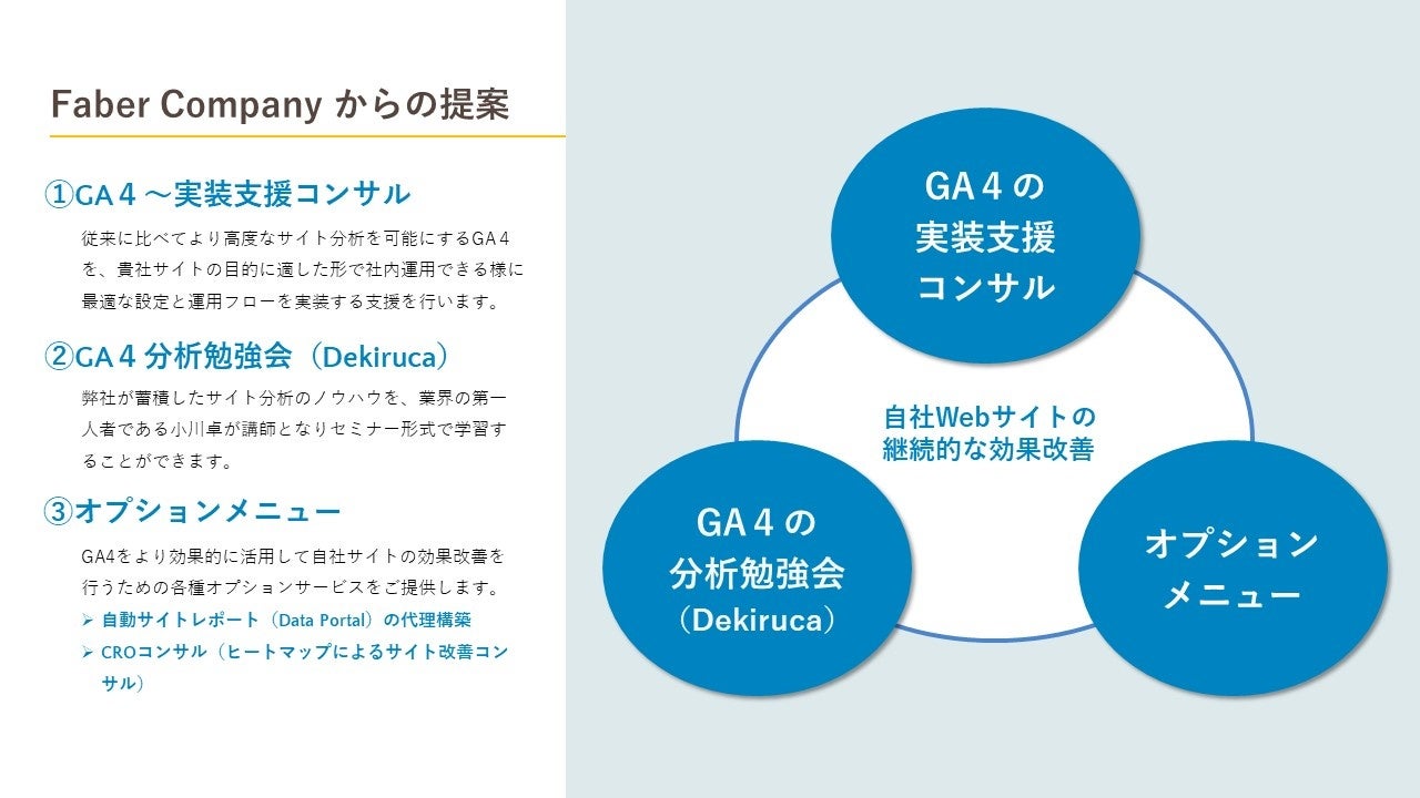 約1,700社のWebマーケティングを支援中の株式会社Faber Company(ファベルカンパニー/本社:東京都港区、代表取締役:稲次正樹・古澤暢央)は、Web解析の第一人者で、当社CAO小川卓監修の元、Google Analytics 4(以下、GA4)への移行を支援するサービスの提供を開始いたします。