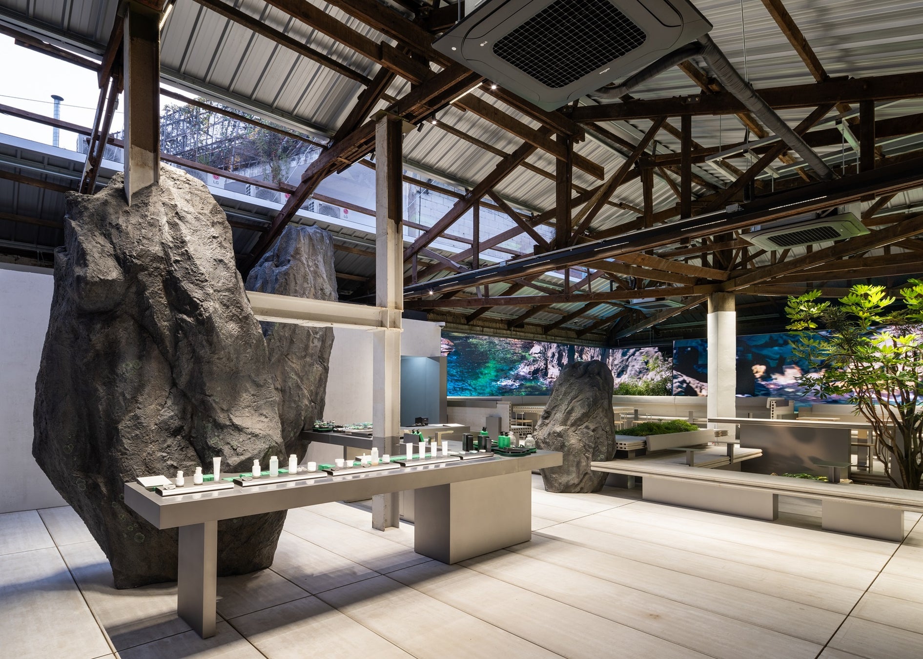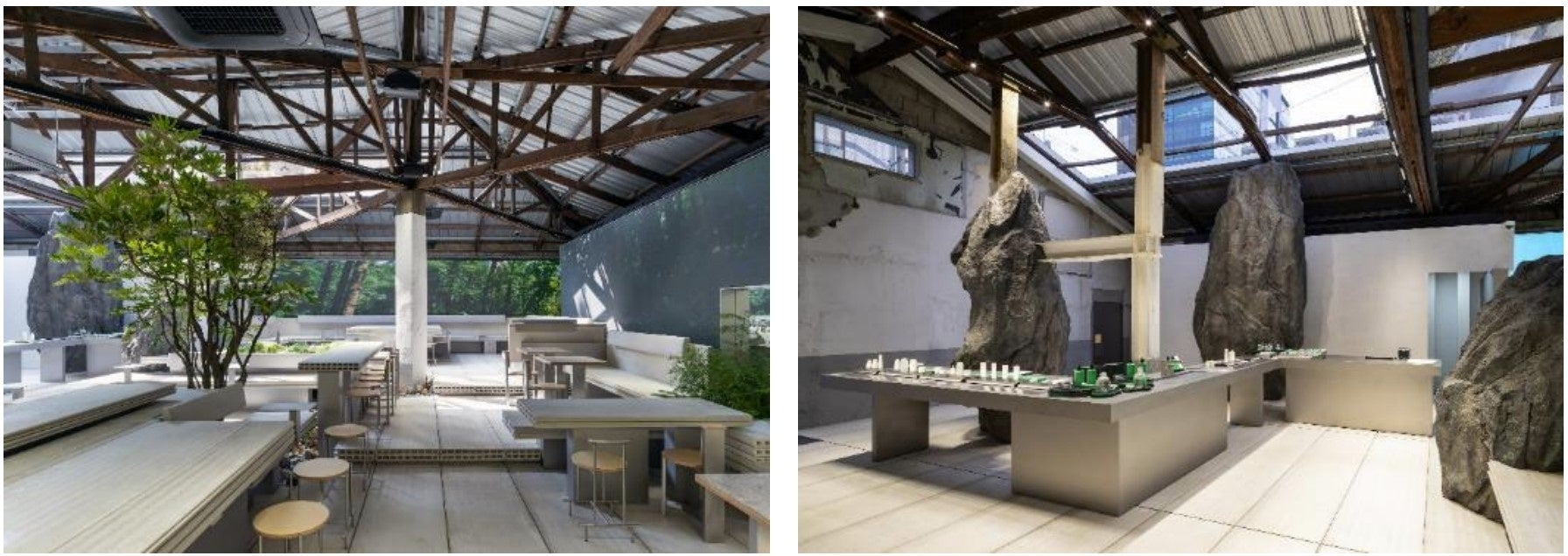 「ジアイル 聖水」のメインスペースは、ストアとカフェで構成され、大自然が感じられる岩のオブジェや植物、平地のない島のような緩やかな傾斜など、実際の自然が空間の中に存在しています。「ジアイル 聖水」ならではの新しい自然が想像力を刺激し、自由を感じる神秘的な空間になります。