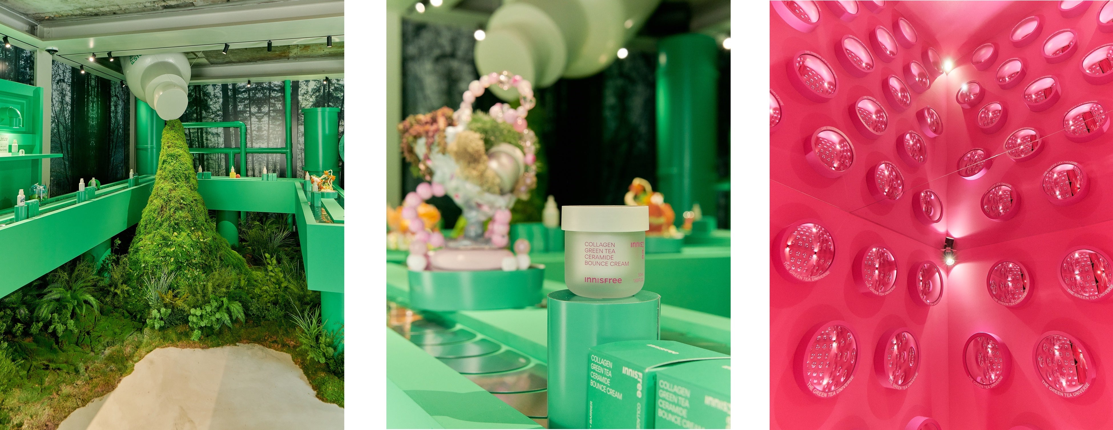 「ポップアップストア」では、イニスフリーの根幹となる成分であるグリーンティーの開拓、発見、製造の過程をレールの上のアートワークで見ることができ、グリーンティー成分のヘリテージ、神秘的な効能に関するストーリーも紹介されています。また、イニスフリーを代表するアイテムのタッチアンドトライや、SNS投稿によるハッシュタグイベント、新製品「コラーゲン グリーンティー セラミド バウンス クリーム」をイメージしたピンクミラーフォトゾーンなど、来場される方々にお楽しみいただけるコンテンツが盛りだくさんです。ポップアップストアは12月20日(水)までの期間限定オープンとなります。