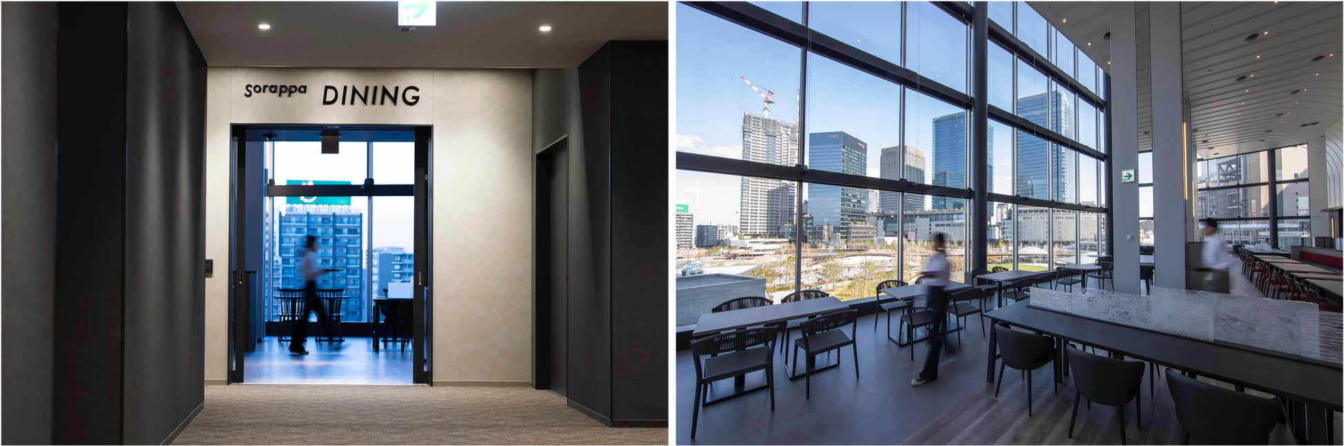「sorappa(ソラッパ)」は、ダイニング、カフェ、ワークスペース、テラスから構成されるワーカー⽤オフィスラウンジです。「グラングリーン⼤阪」が掲げる重要な要素であるウェルネスに対し、ウェルビーイングと深く関わる「⾷と健康」の観点からアプローチいたします。