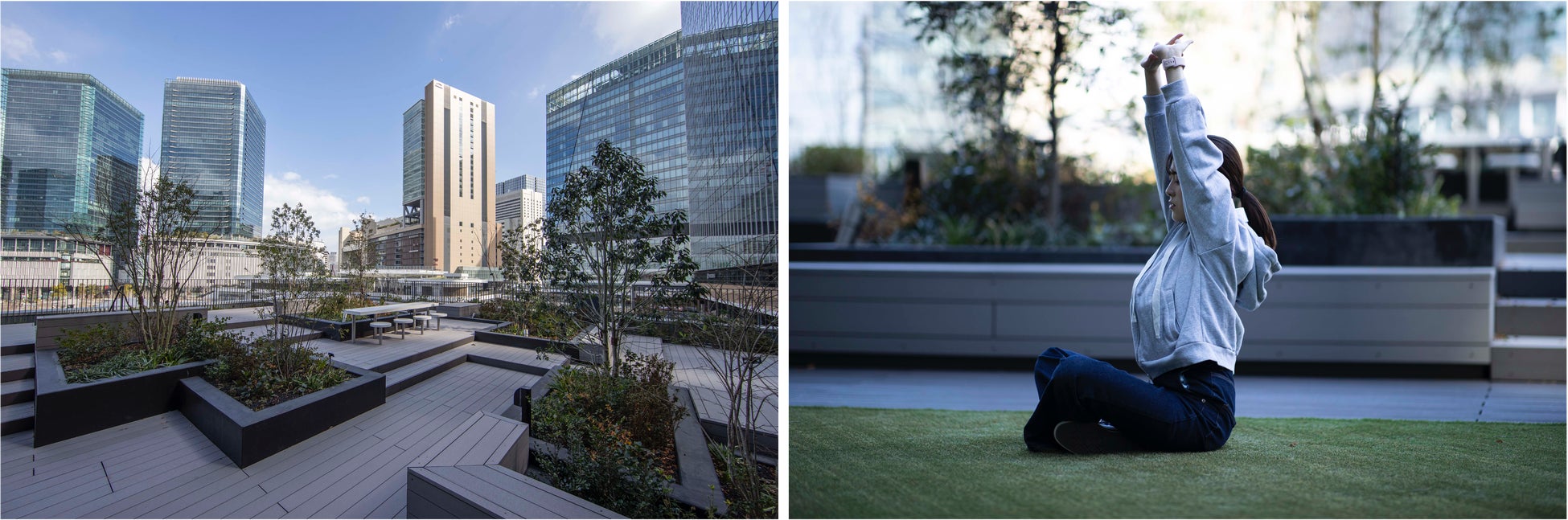 隣接するSLOW AND STEADYとも連携し、⽇々の健康を計測しながら健康的なライフスタイルを⽀援します。テラスでは、マインドフルネス・ヨガプログラムなどの様々なワーカー向けイベントを開催する予定です。また、同フロアには誰もが利⽤したくなる「MY FAV Restroom」を整備しており、ジェンダーや幅広い⽤途に対応し、どなたでも快適にご利⽤いただけます。