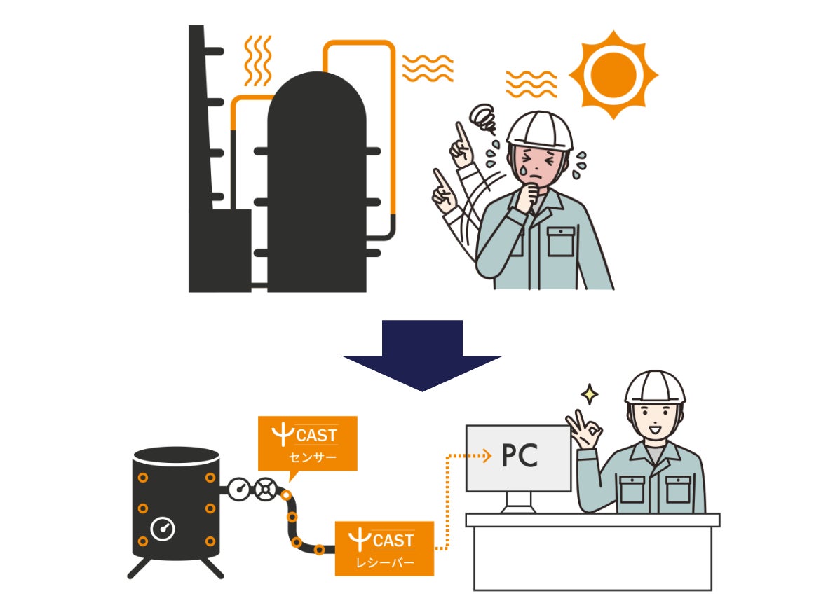 しかし、センサー自体は高温部・狭所・高所に「つけっぱなし」にできますが、モニタリングをするためには、専用のシステムをインストールしたパソコンを工場内に持ち込み、配管の足元まで行き、センサーとつながなければいけません。