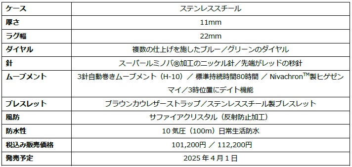 ミリタリーをルーツにもつ本格機能に加えて、アクティブに生きる都会的なスタイルにマッチするブルーとグリーンの2つの文字盤が追加されます。中央のサンレイと同心円状に施されたアワーリングの2つの異なる仕上げが、光と影のコントラストを生み出し、この時計にさらなる上品さを与えています。