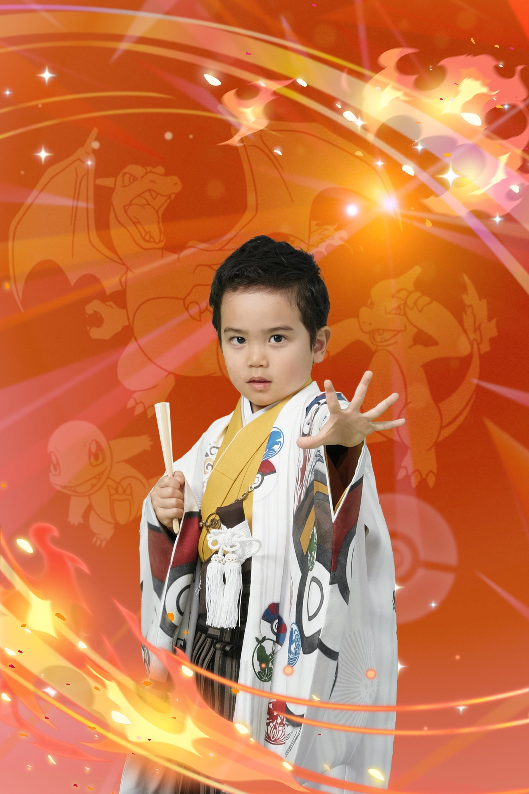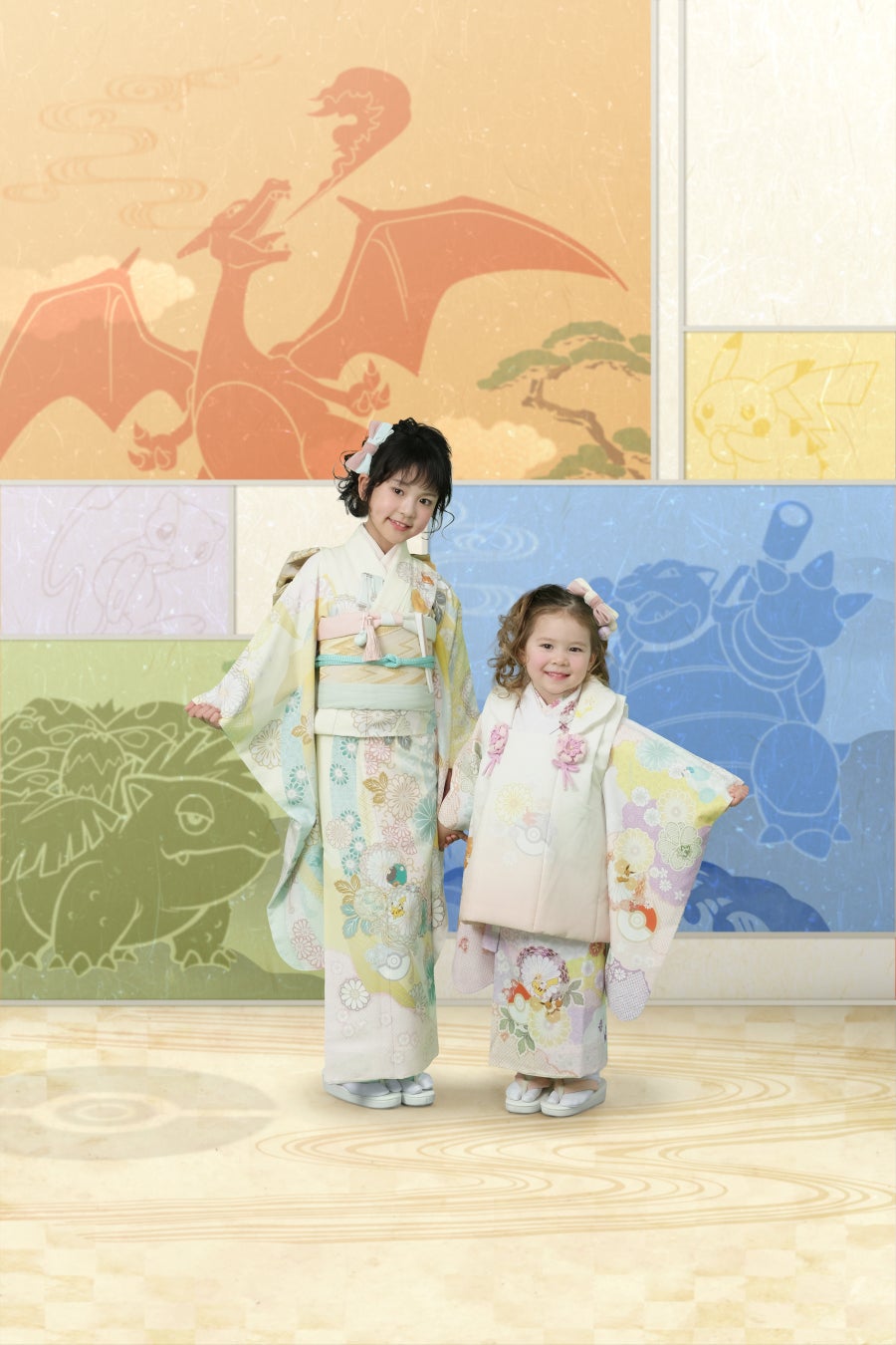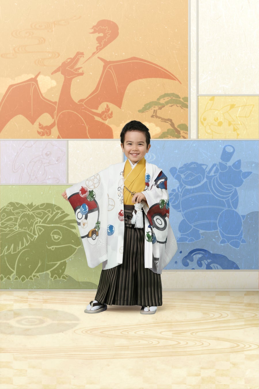 『ポケットモンスター 赤・緑』のパートナーポケモンの進化形ポケモン3体(フシギバナ・リザードン・カメックス)と、伝説のミュウ、そしてピカチュウを、日本画のような和テイストで描いた、ポケモン和装でしか撮影できない特別な背景です。ご兄弟での撮影にもご使用いただけます。