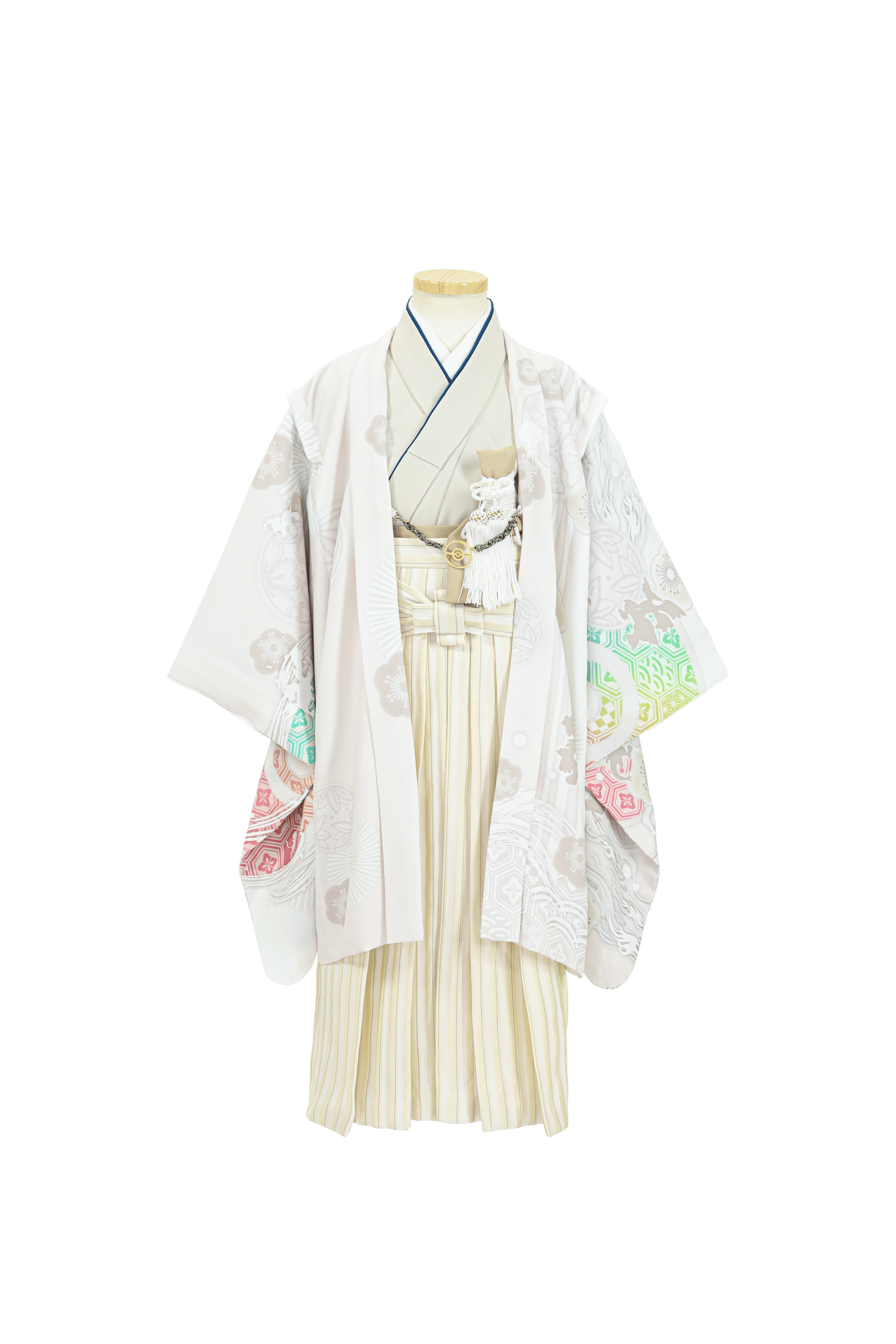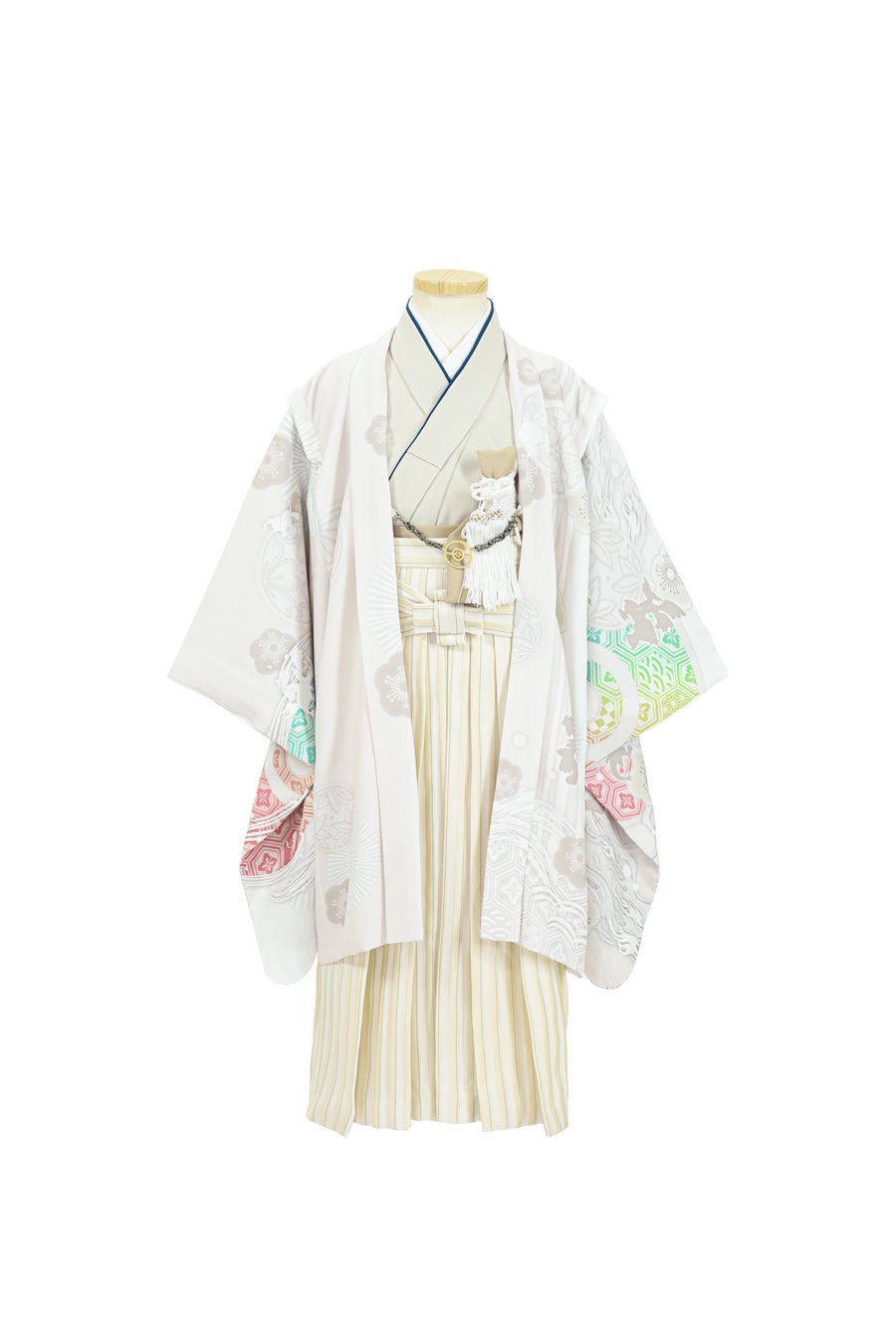 背面の「ミュウツー・ミライドン、コライドン」をメインに、歴代の伝説ポケモンが集合。『ポケットモンスター 赤・緑』から30年の歴史を1着で表現いたしました。100㎝同様お子様だけでなく、親世代も一緒に楽しんで頂けるデザインです。モンスターボールで使用している七色は「多幸・健やかな成長」の意味があり、ハレの日にふさわしい1着に。羽織紐には3歳とお揃いの「モンスターボール羽織紐」を初導入。
