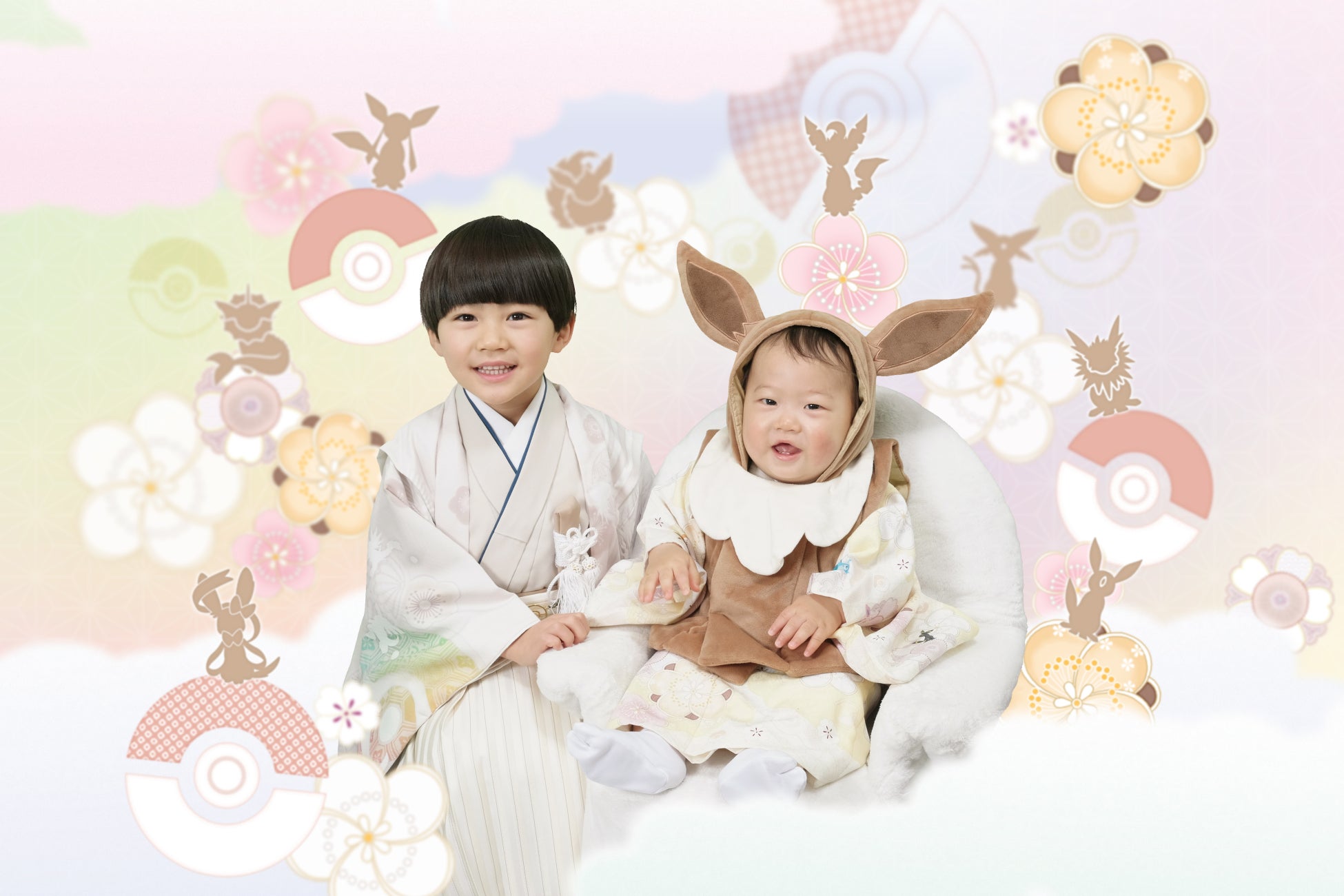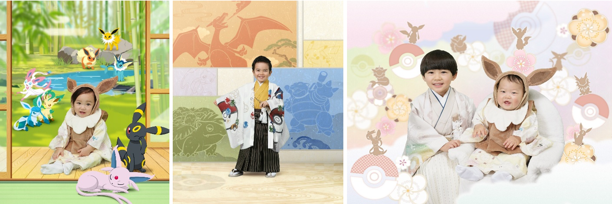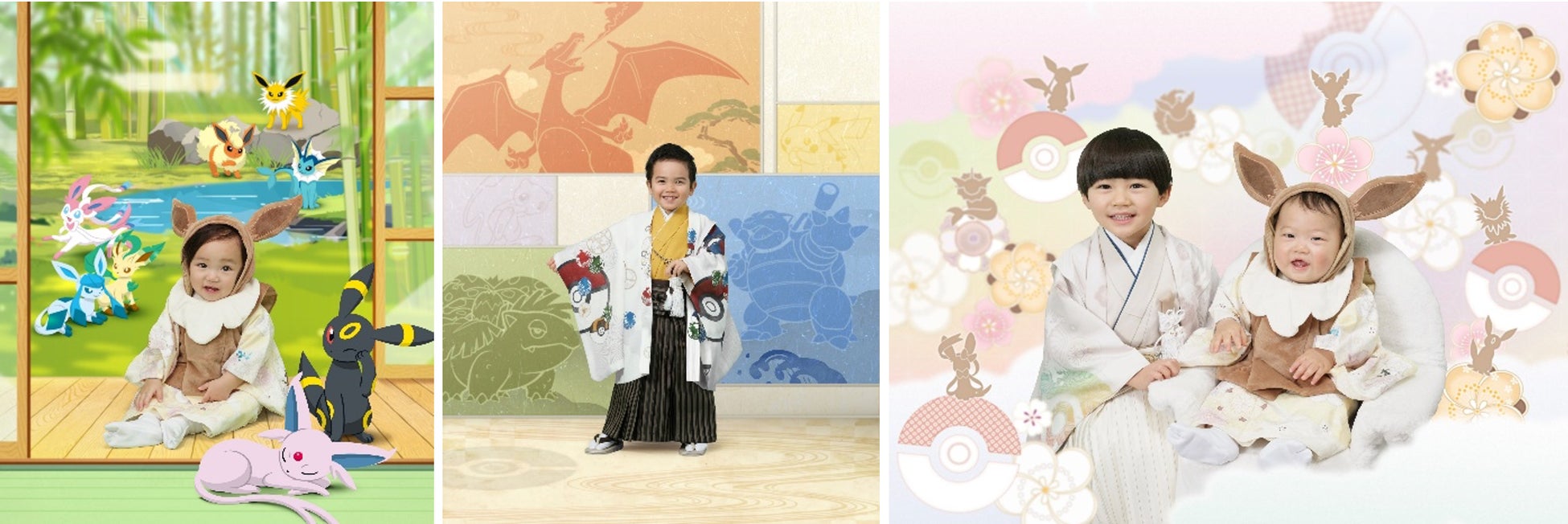 イーブイの進化形ポケモン8種をメインデザインとした特別な背景です。「ポケモンの進化=お子様の成長」を表現し、お子さまとポケモンたちが日本の伝統的な風景の中で元気に過ごす姿を描いています。撮影スタイルに合わせて、イス座りバージョンと地べた座りバージョンをご用意しています。