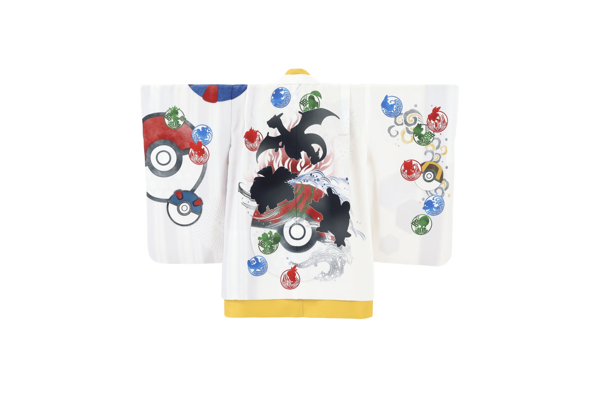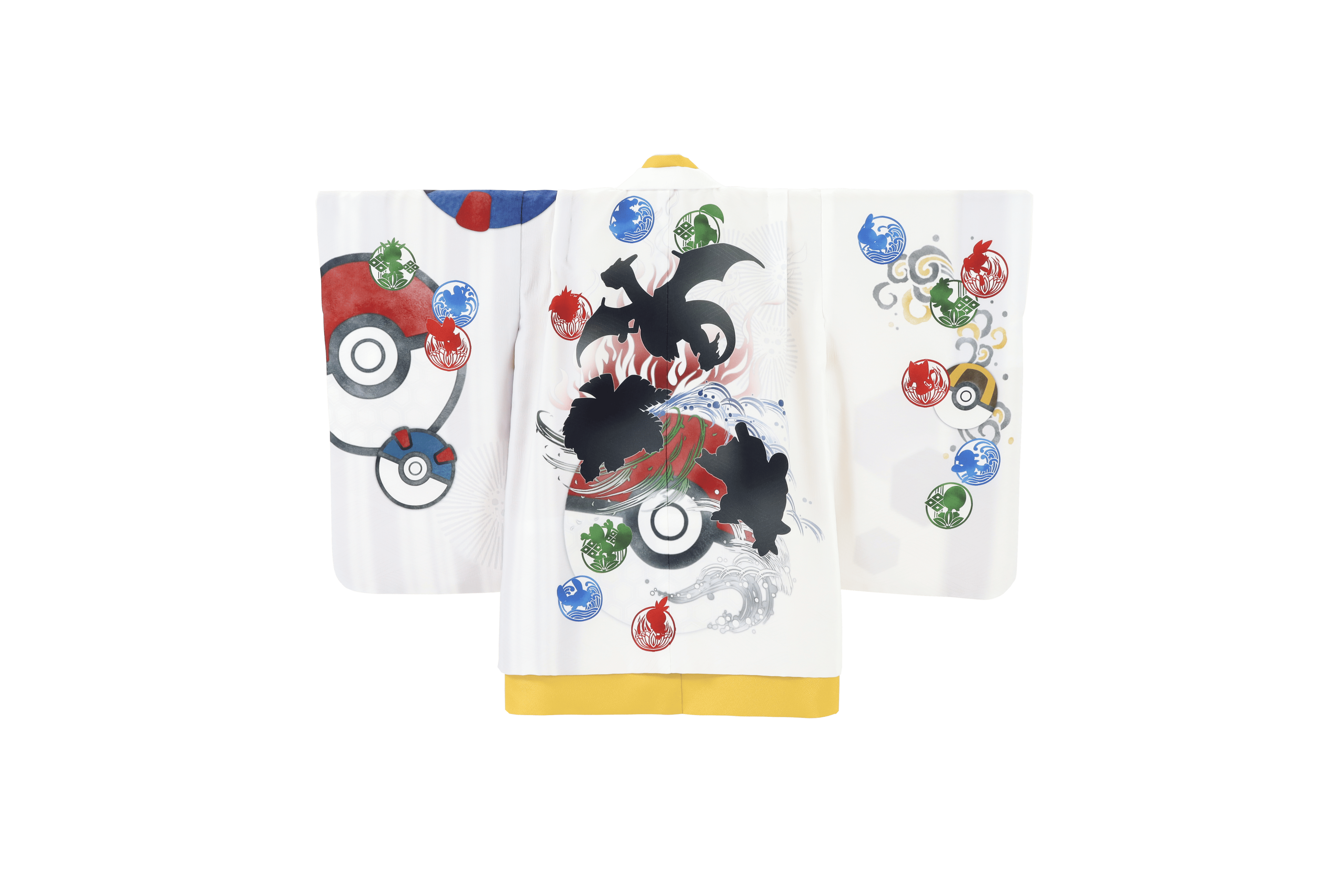 世代を超えて引き継がれるパートナーポケモンの世界観を表現し、背面は『ポケットモンスター 赤・緑』のパートナーポケモンの進化形「フシギバナ・リザードン・カメックス」のシルエットで唯一無二の1着に。お子様だけでなく、親世代も一緒に楽しんで頂けるデザインです。ハレの日に相応しい伝統古典柄とポケモンの属性を表す水・草・炎のデザインを上手く融合させました。羽織紐には5歳とお揃いの「モンスターボール羽織紐」を初導入。