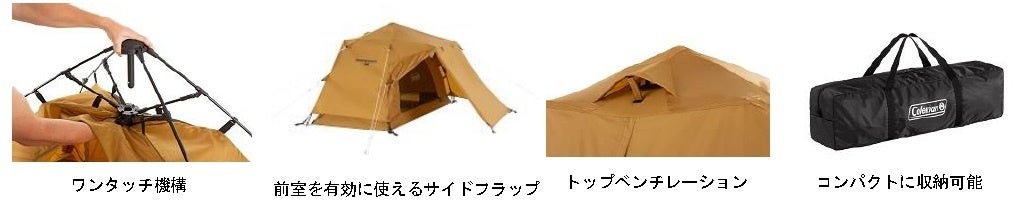 ハブを合わせるだけでインナーテントを完成できるワンタッチ構造により、設営・撤収を簡単にできます。広い前室空間は、荷物の保管や日よけ雨よけに便利です。また雨の浸入を軽減して前室を有効に使えるサイドフラップ開閉機能や温まった空気を排出するトップベンチレーションなどソロキャンプを快適にする機能を搭載しています。