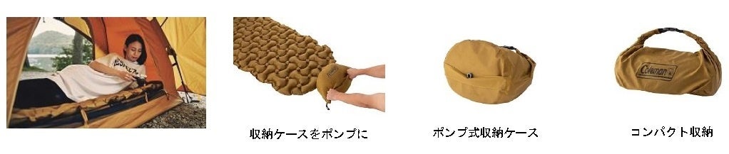 従来の製品に比べて横幅が約40%アップしており、寝返りしてもマットから落ちづらいワイドサイズのマットです。収納ケースをポンプとして利用し簡単に膨らますことができ、2つのバルブがあるので、収納の際もあっという間に空気の抜き取りが可能です。