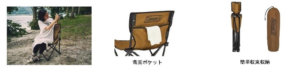 軽量・コンパクトなので手軽に持ち運びができ、簡単設営・撤収が可能なローチェアです。コンパクトながら背面には小物が収納できるポケットも備えています。