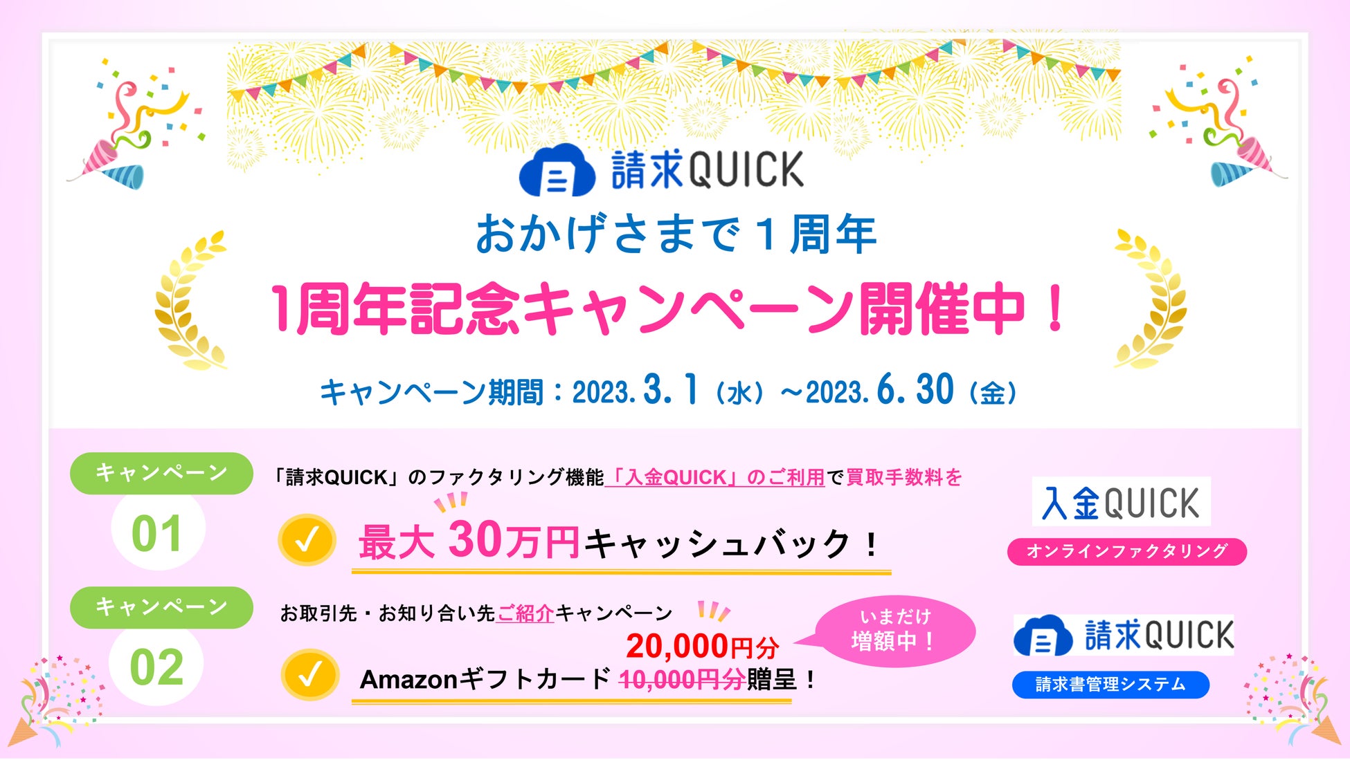 「請求QUICK」は2023年3月にサービス提供開始から1周年を迎えました。おかげさまで2,000社を超える企業様に継続利用のお申し込みをいただき、多くのお客さまからご好評をいただけるサービスになりました。「請求QUICK」をご利用いただいているお客さまへの感謝の思いと、かんたん・便利なオンラインファクタリング「入金QUICK」のご紹介を兼ねて「請求QUICK 1周年記念キャンペーン」を6月末まで開催中です。