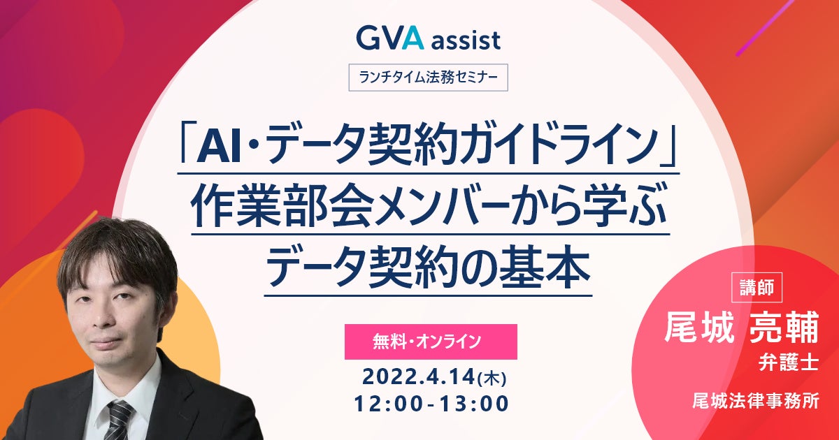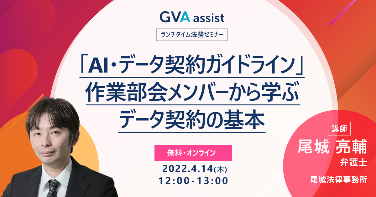 リーガルテックサービス「GVA」シリーズを提供するGVA TECH株式会社(本社:東京都渋谷区、代表取締役:山本 俊、以下GVA TECH)は、2022年4月14日(木)12時から、尾城法律事務所(所在地:東京都中央区)の尾城 亮輔弁護士に「データ契約」について解説いただくセミナーを開催することをお知らせいたします。