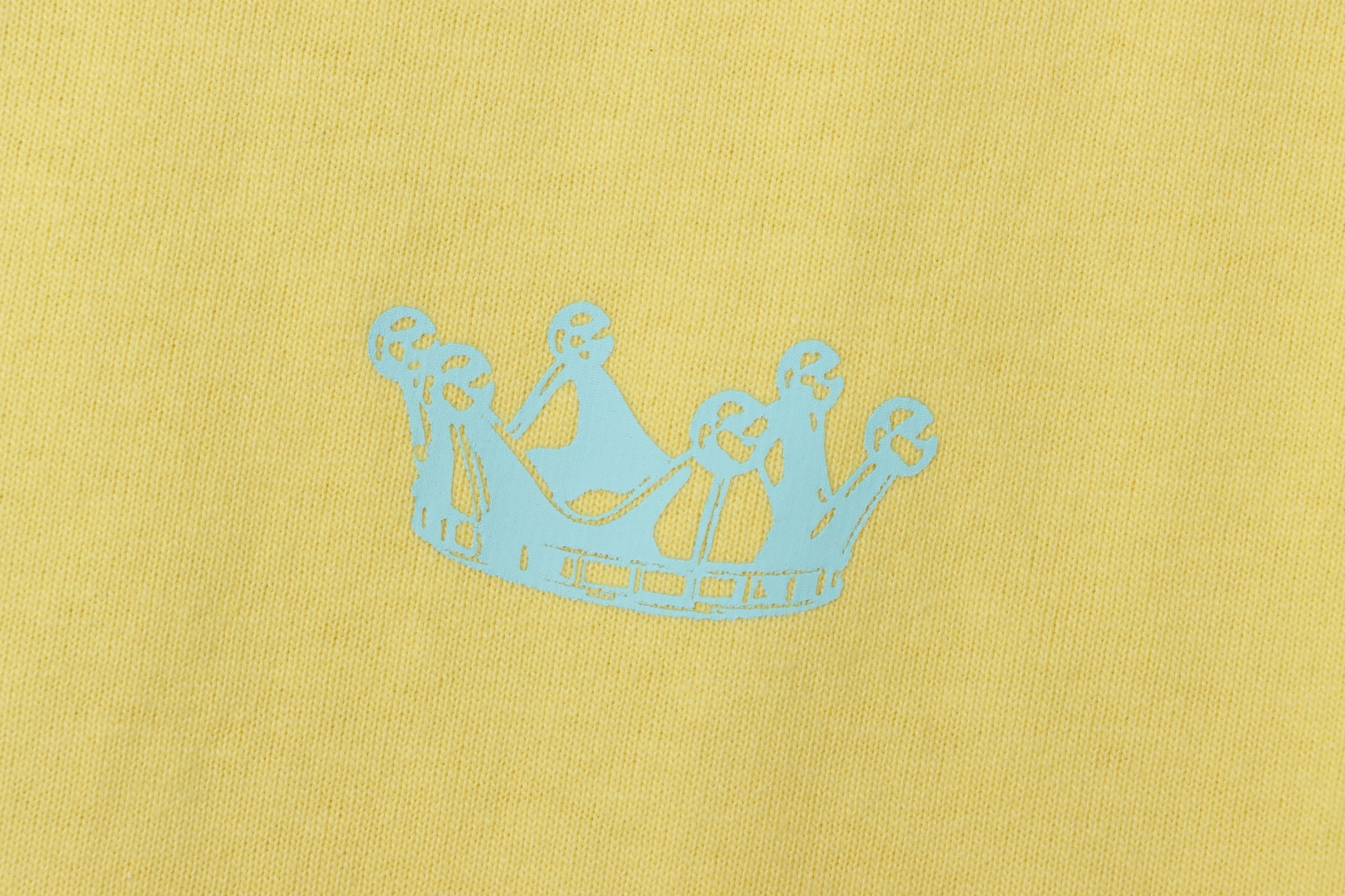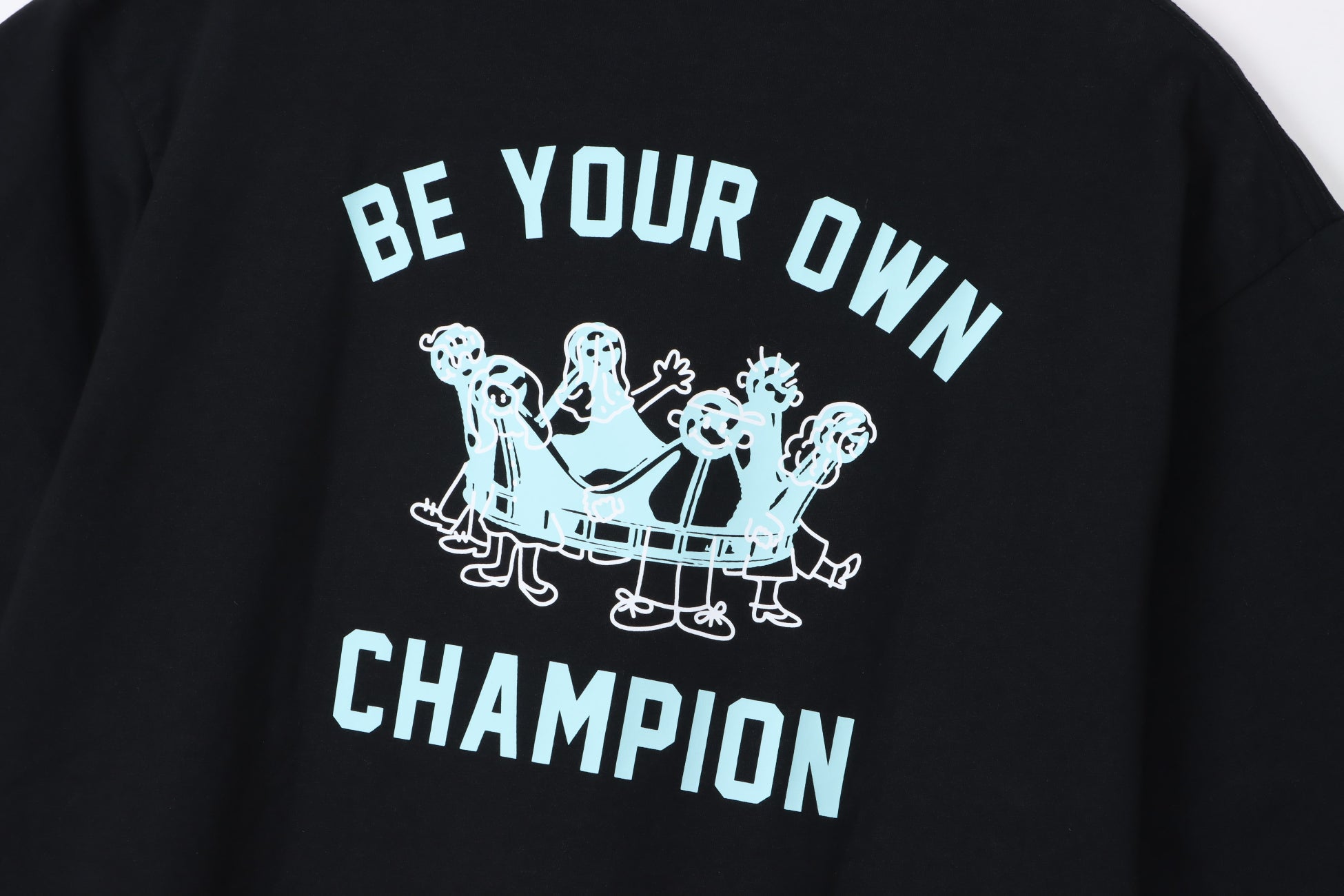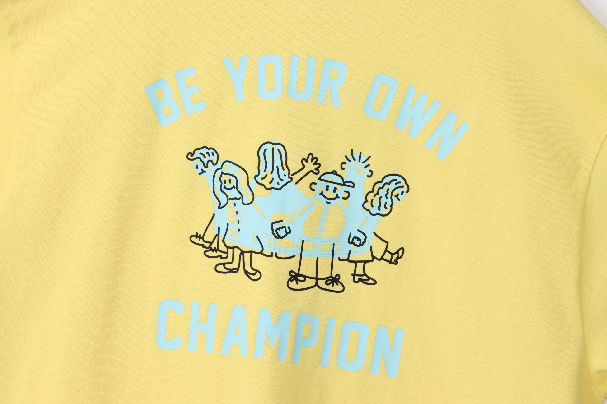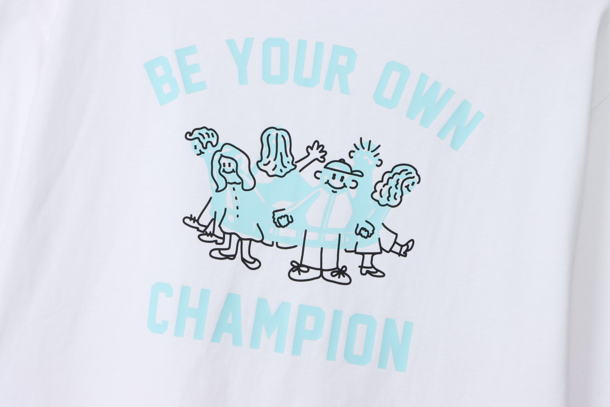 もう一つは、Championというワードから「王冠」をイメージし、王冠のイラスト上に手を繋ぎあったキャラクターが描かれています。キャラクターが敢えて内側に向かずに、手を繋ぐことで「他人を意識せず、自分らしい生き方を」という意味が込められた、まさに“BE YOUR OWN Champion”なデザインです。カラーはホワイト、ブラックに加え、ペールイエローの3色展開で販売いたします。