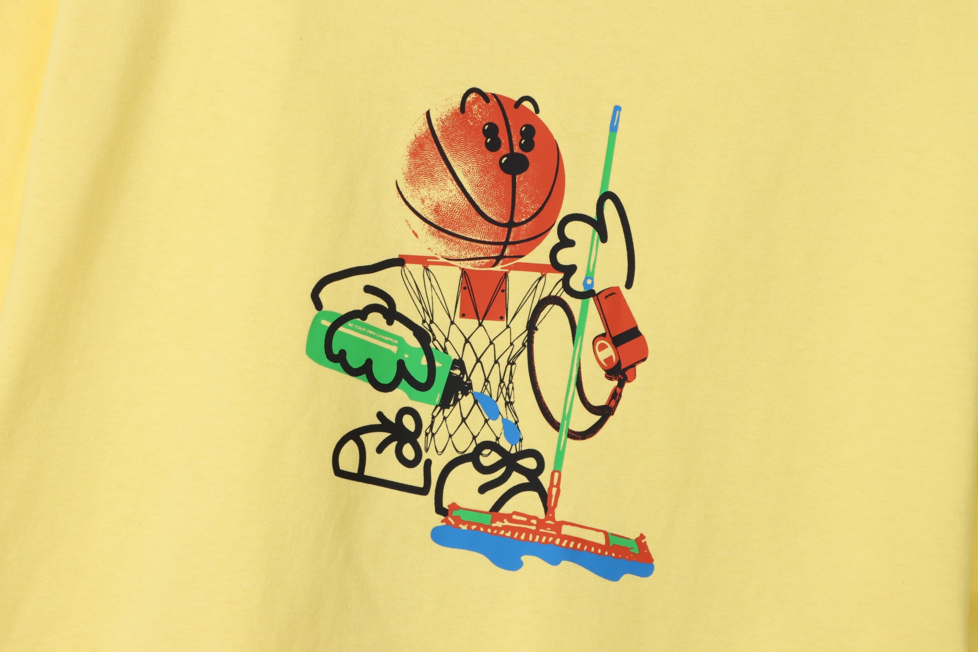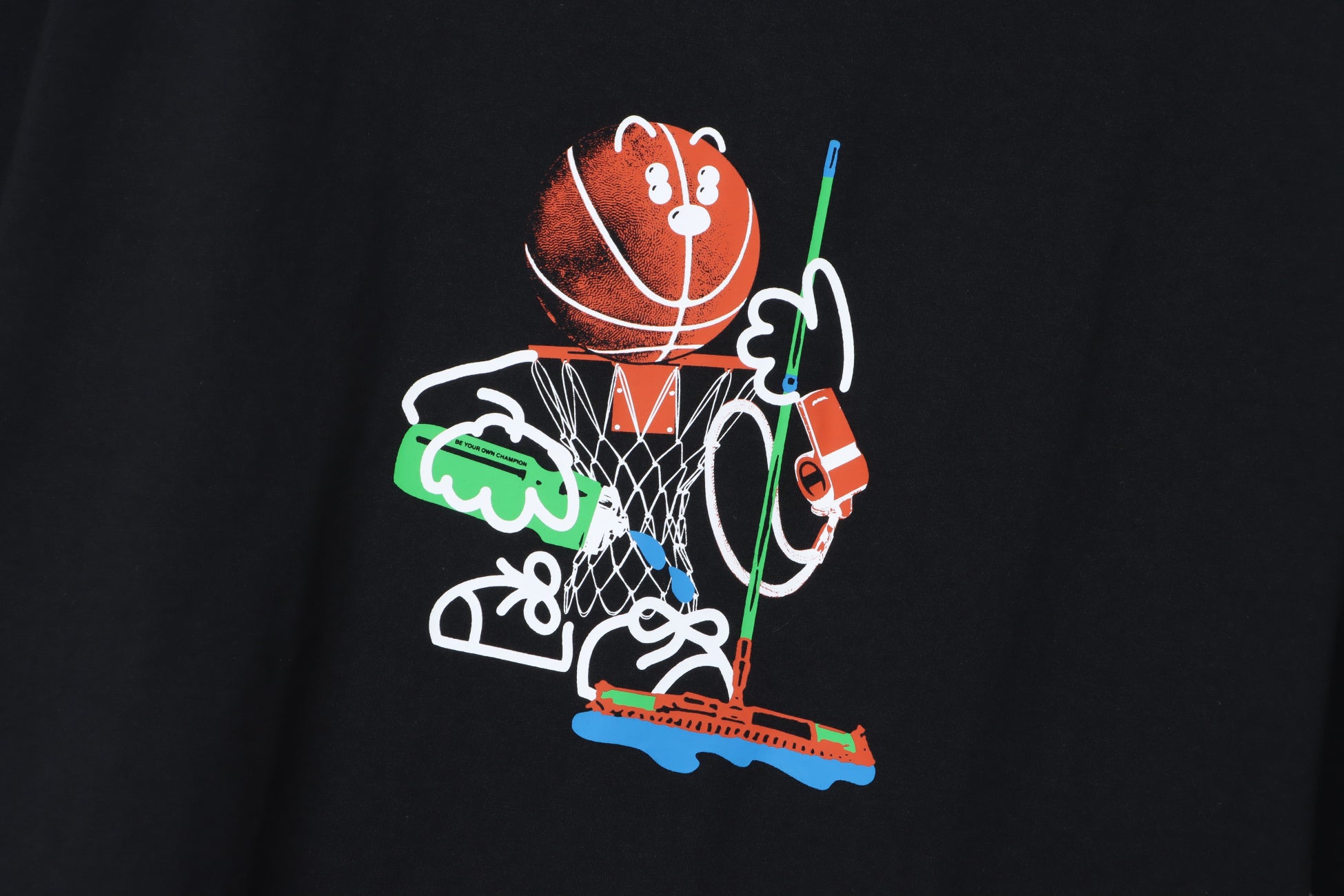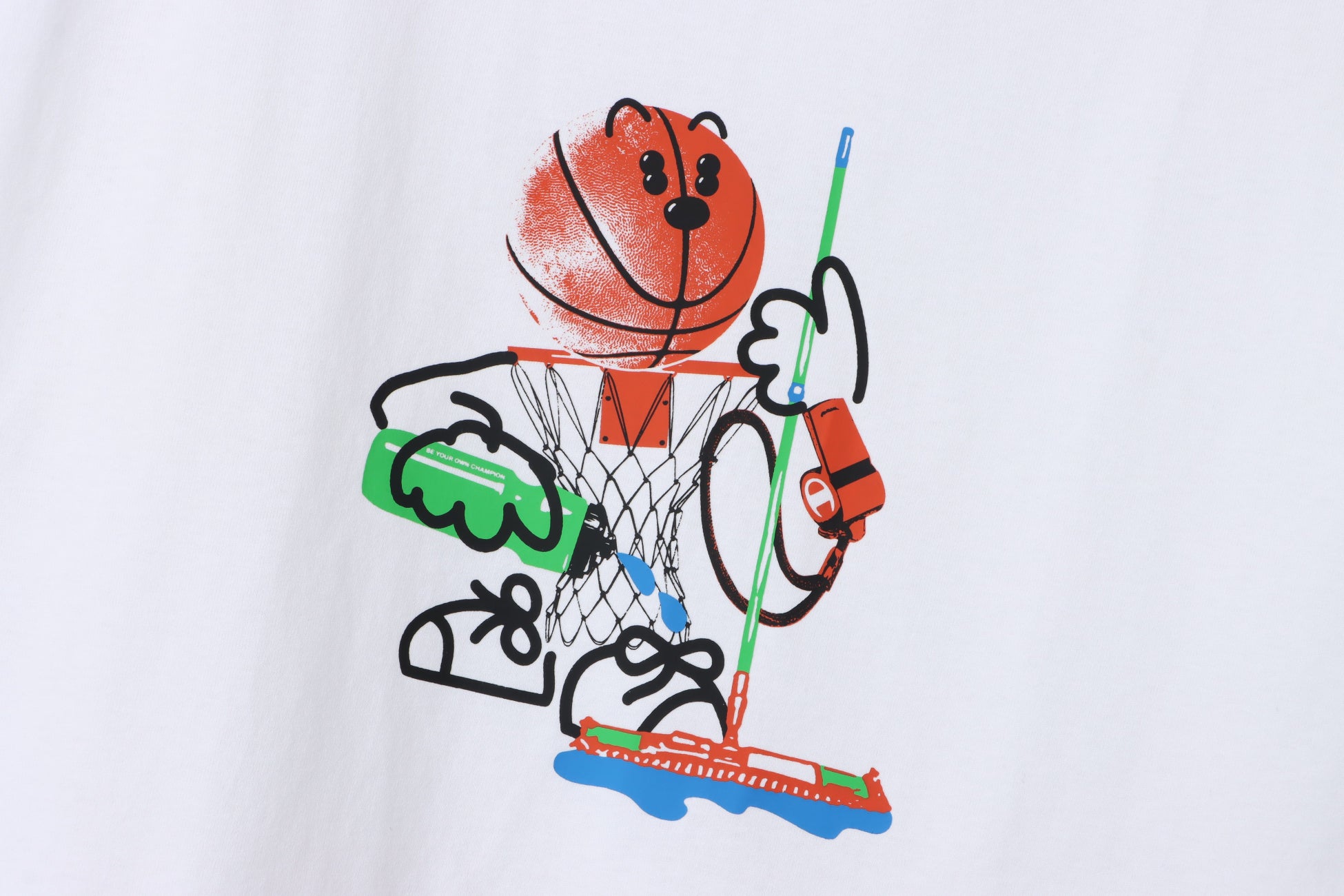 一つは、 Championの長い歴史の中で深い関わりのあるスポーツ“バスケットボール”をモチーフにバスケットボールやゴール、ホイッスル、モップなどを組み合わせた明るくポップなキャラクターのグラフィックです。