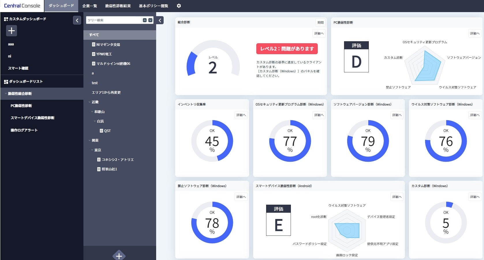 「CenralConsole」では紐づけ登録を行った企業のセキュリティ診断結果を統合して全体参照し、グループ企業統合管理を行うことができます。