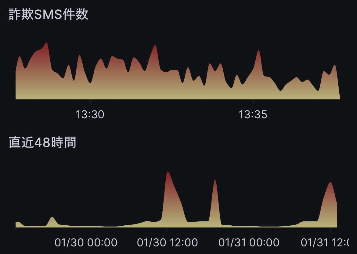 詐欺SMSの検知状況をリアルタイムにグラフ化します。詐欺SMSの発生が集中している時間帯がビジュアルでわかります。特に、昼の12時〜13時頃(仕事や学校の休憩時間)、夜の19時〜20時頃(帰宅後リラックスして過ごす時間)など、生活の中でスマートフォンを見る機会が増えやすい時間帯に、グラフに大きな変動が発生する傾向があります。