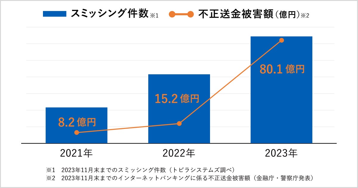 近年、フィッシングなどを含む詐欺SMSの増加が社会問題となっています。トビラシステムズの調査で、2023年1月〜11月に確認されたフィッシング詐欺のSMS(スミッシング)の件数は、前年同期比で1.8倍に増加しています。また、警察庁と金融庁が発表したフィッシングによるものとみられるインターネットバンキングに係る不正送金被害額は、2023年11月末において約80.1億円となり、過去最多を更新しています(※)。