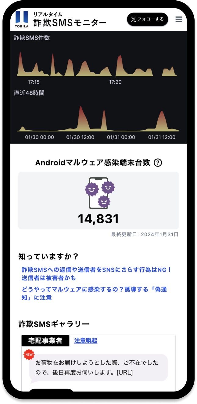 詐欺SMS発生状況やマルウェア感染スマホ台数をわかりやすく可視化