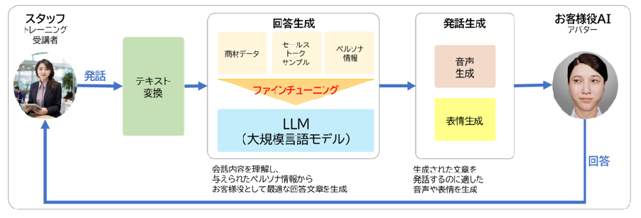通常の接客ロールプレイングは、受講者とお客様役の二人一組で実施されますが、“mimik NEST”では、AIがお客様役となってトレーニングを行うことが可能となり、さらに効果的なトレーニングが可能となります。