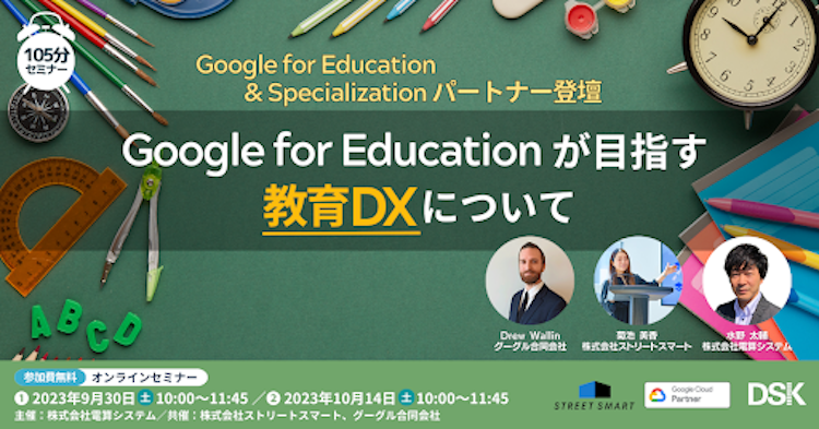 ストリートスマート(所在地:大阪府大阪市北区、代表取締役社長:森田 竜次)は、株式会社電算システム(本社:岐阜県岐阜市日置江、代表取締役社長執行役員:高橋 譲太)主催、Google for Education™ 共催の無料オンラインセミナーに登壇いたします。