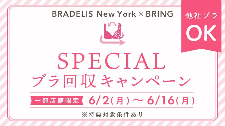そしてこのたび、環境省が定める環境月間に合わせ、6月2日から16日までの期間中、表参道店・新宿マルイ店・横浜ジョイナス店・心斎橋店・ルクア大阪店にて「SPECIAL ブラ回収キャンペーン」を実施いたします。ご不用になったブラアイテム(他社商品も可)をお持ち込みいただいた方には、再生資材を使用したBRINGコラボエコバッグをプレゼントいたします。(※特典対象条件あり)