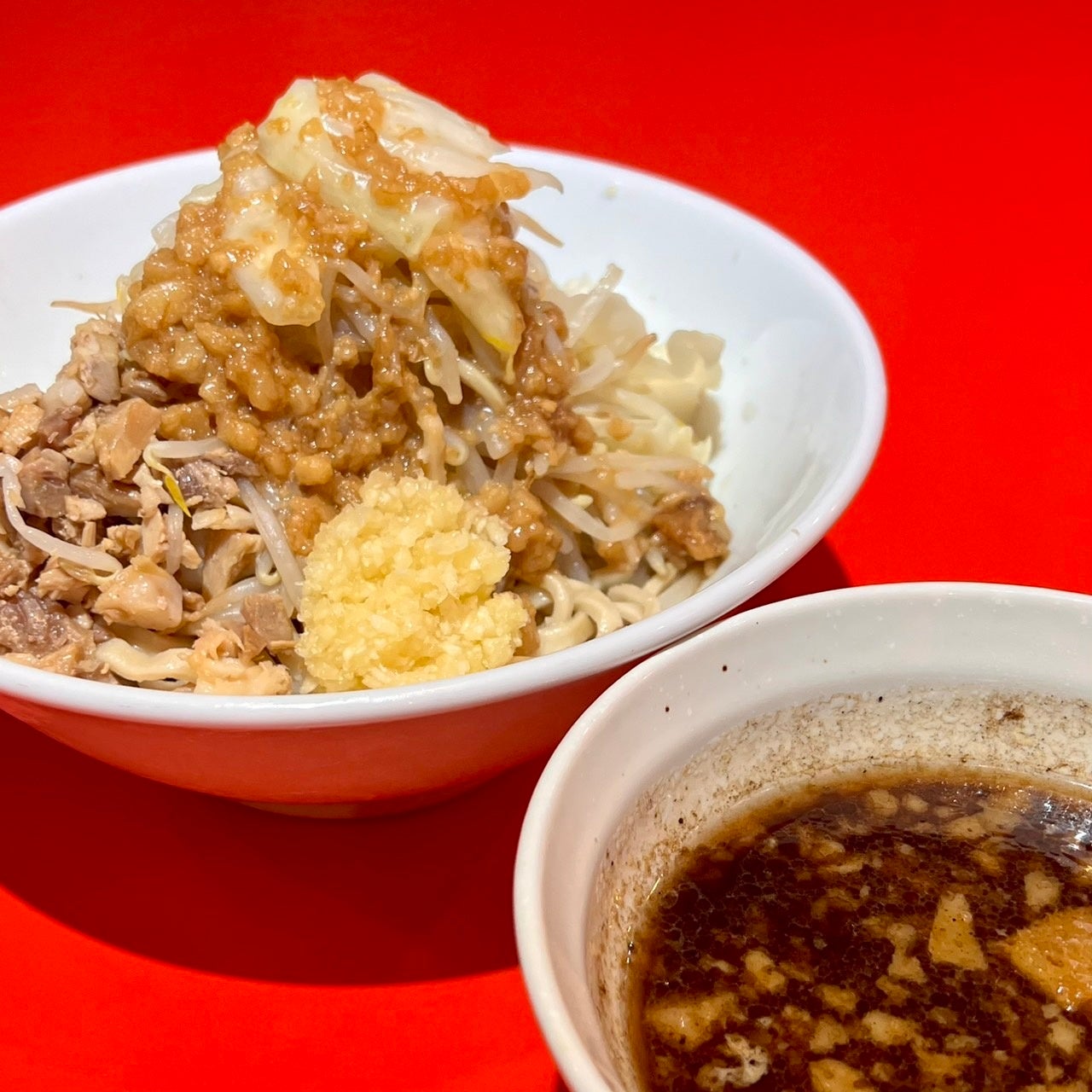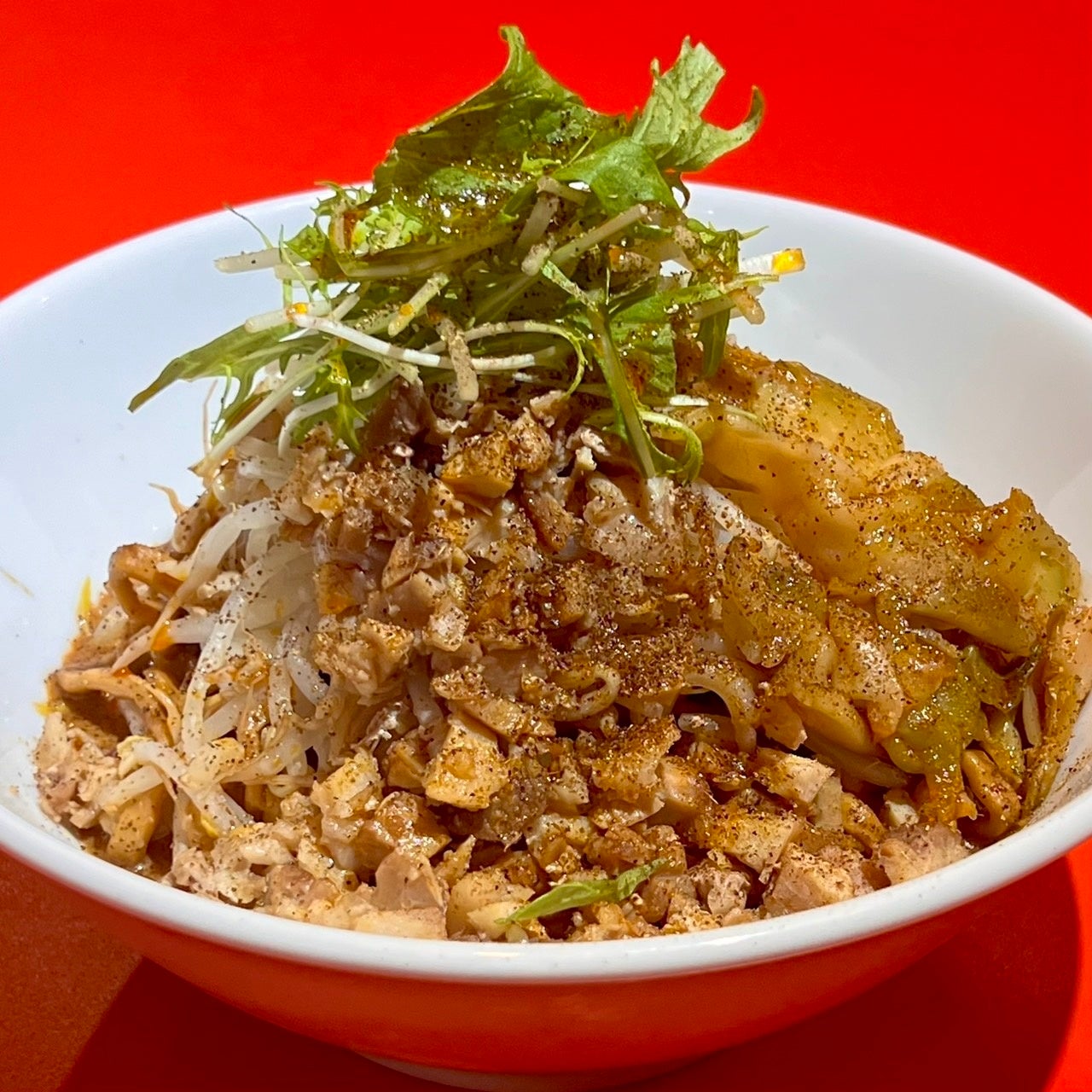 歌舞伎町店限定「豚坦々」:汁なし担々麺を二郎系にアレンジした一品。隣接する中華居酒屋「飲飲酒場」のテイストを取り入れ、より濃厚な味わいに仕上げています。