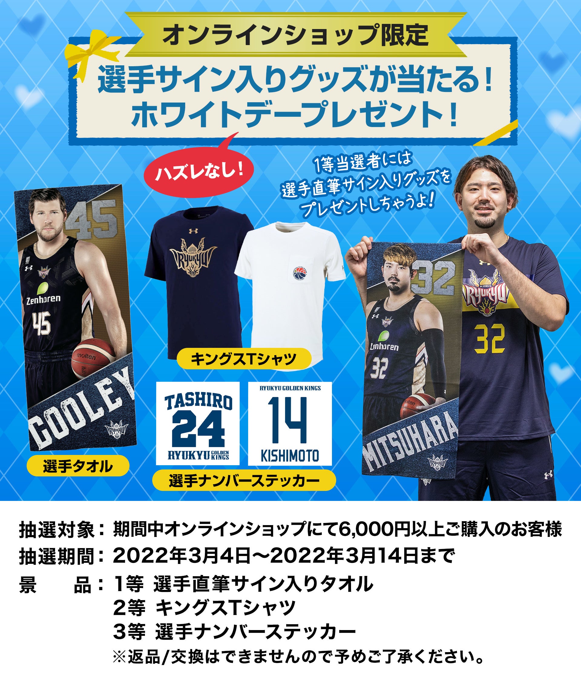 さらに!選手からのホワイトデープレゼントとして、キングスオンラインショップにて6,000円以上お買い上げの方を対象に、キングスオリジナルグッズをプレゼントいたします。何が当たるのかは届いてからのお楽しみ!ぜひオンラインショップにてお買い物をお楽しみください。