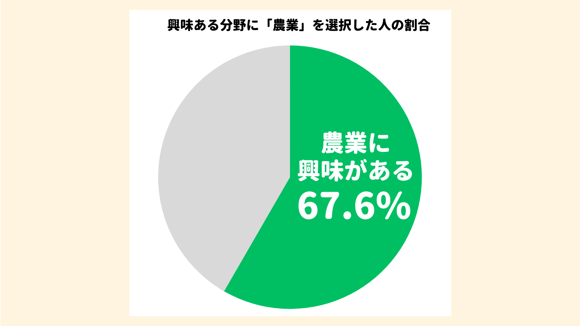 おてつたび登録者にアンケートを行った結果、興味ある分野に「農業」を選択した人の割合は67.6%となっており、農業に対する関心が高いことがわかります。