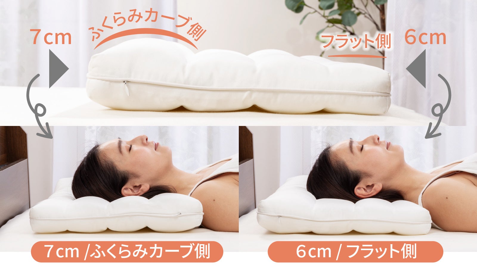 約6cmのフラット側と約7cmのふくらみカーブ側設計で、どちらから寝ても頭をのせた時に約3cmの厚みと「低め」の高さになります。低いことのメリットは、自然な頸椎カーブへ導き首や肩回りに負担がかかりにくいことと、気道が開きやすく呼吸しやすくなること。ストレートネックの方はもちろん、首の間隔が狭い小柄な女性やお子様にもおすすめです。