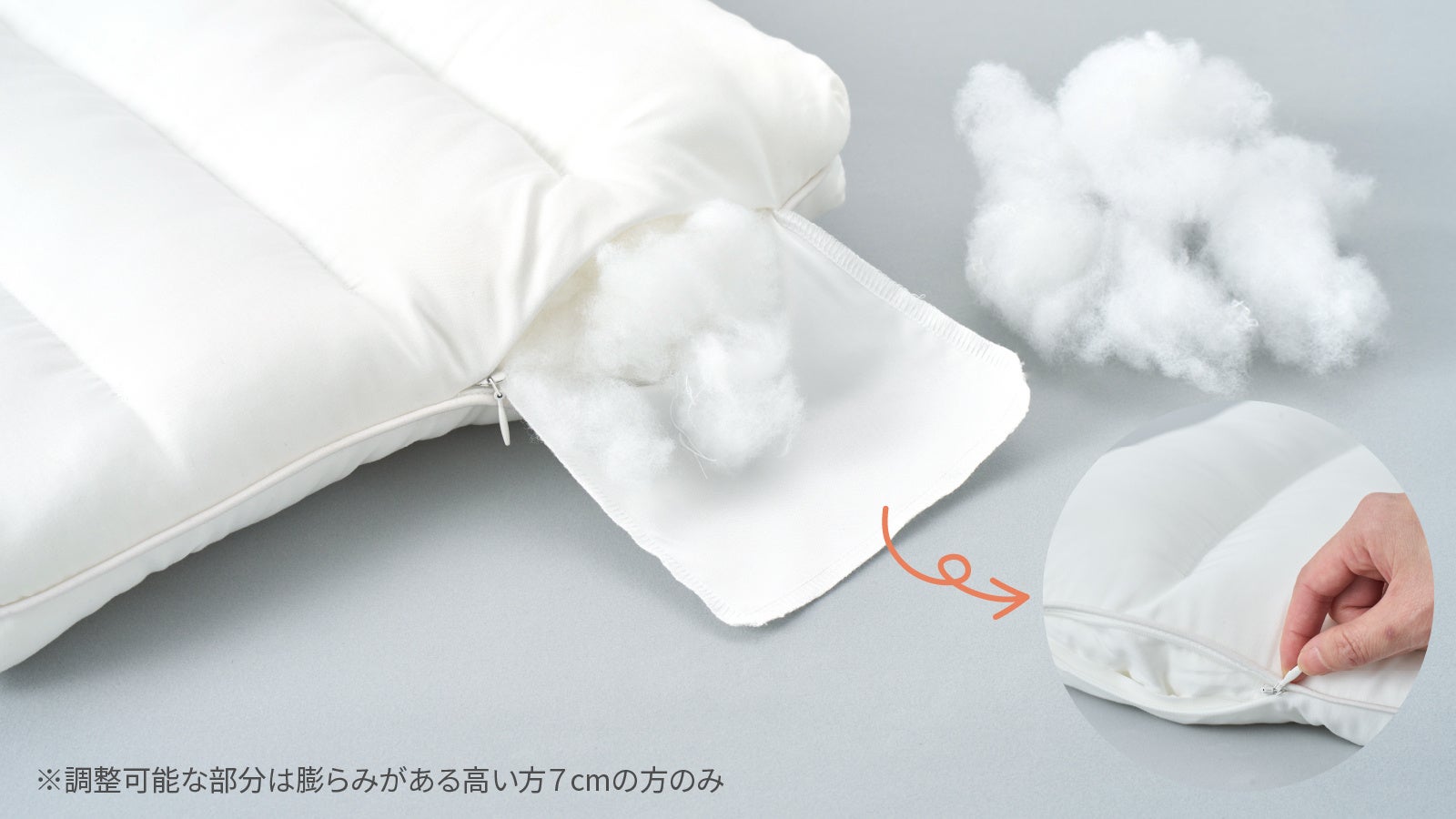 枕本体側面の片方のカーブの調節口ファスナーから、中綿を簡単に出し入れが可能です。お好みに合わせて、高さを自由に調節いただけます。また調整口は中布蓋付きのため、中綿が飛び出しにくく安心です。
