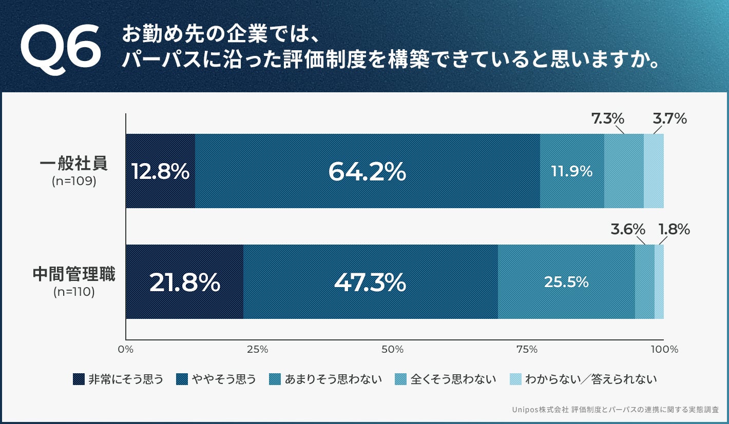 バリュー評価などを含む、『パーパスに沿った評価制度を構築できていると思いますか』という質問では、一般社員と管理職のいずれも過半数が肯定的な回答となりました。