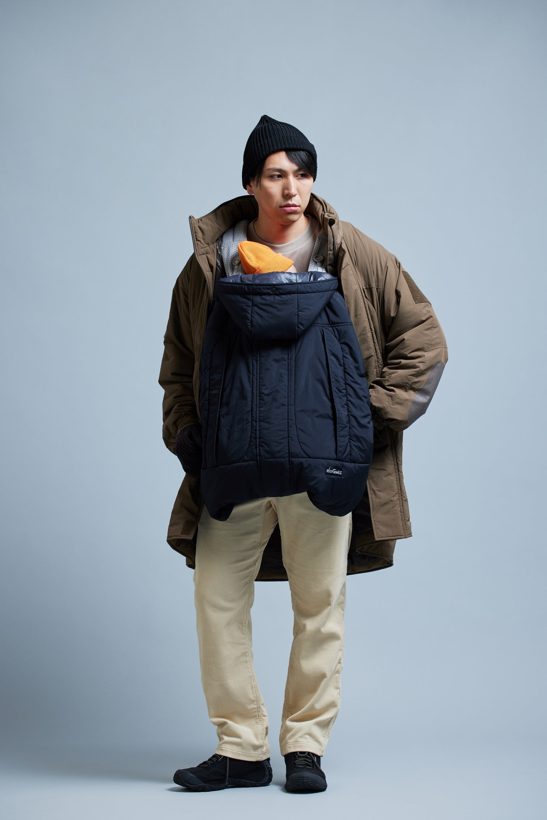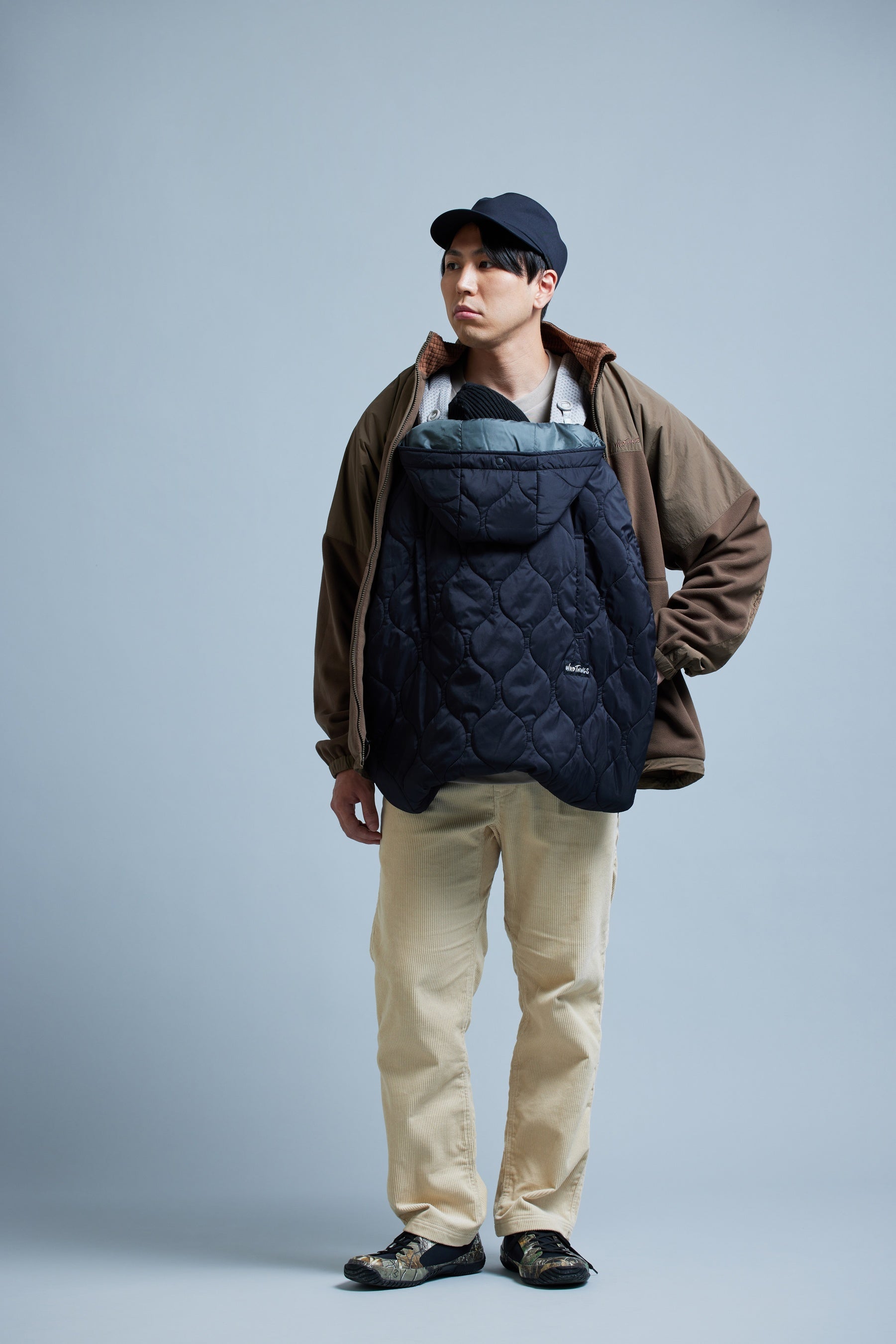 ミリタリーのライナーをベースにデザインされたオニオンステッチのキルティングがポイントの防寒ケープ。重さはBabyHopperの防寒ケープシリーズ最軽量の約220g。厚着するシーズンにも軽やかな付け心地で快適。保温性にも優れ、秋から冬まで長い期間使用できます。