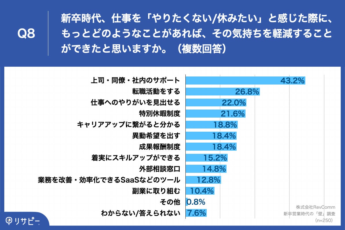 そこで、仕事を「やりたくない」と感じた際に、乗り切った方法を伺うと、「仕事外でストレスを発散する」(36.0%)や「慣れるまで割り切る」(32.0%)、他にも「商品を覚え、わからないことを減らした」や、「お客さん訪問は好きだったので、ひたすらアポイントをかけて、外出するようにした」などの経験談が挙がりました。また、「やりたくない」気持ちの軽減のために、43.2%が「上司・同僚・社内のサポート」が欲しかったと、社内の人間関係が仕事のやる気に大きく影響していることが分かりました。新卒の5月頃を振り返ると、「社内のさまざまな年代のかたと積極的に仲良くなる」ことや、「経理、経営、経済の勉強、および新聞の購読」などをやっておけば良かったという声が多数挙がりました。