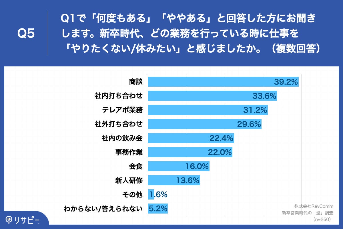 - 新卒時代「やりたくない」と感じた業務、第1位「商談」(39.2%)、第2位「社内打ち合わせ」(33.6%)、第3位「テレアポ業務」(31.2%)
