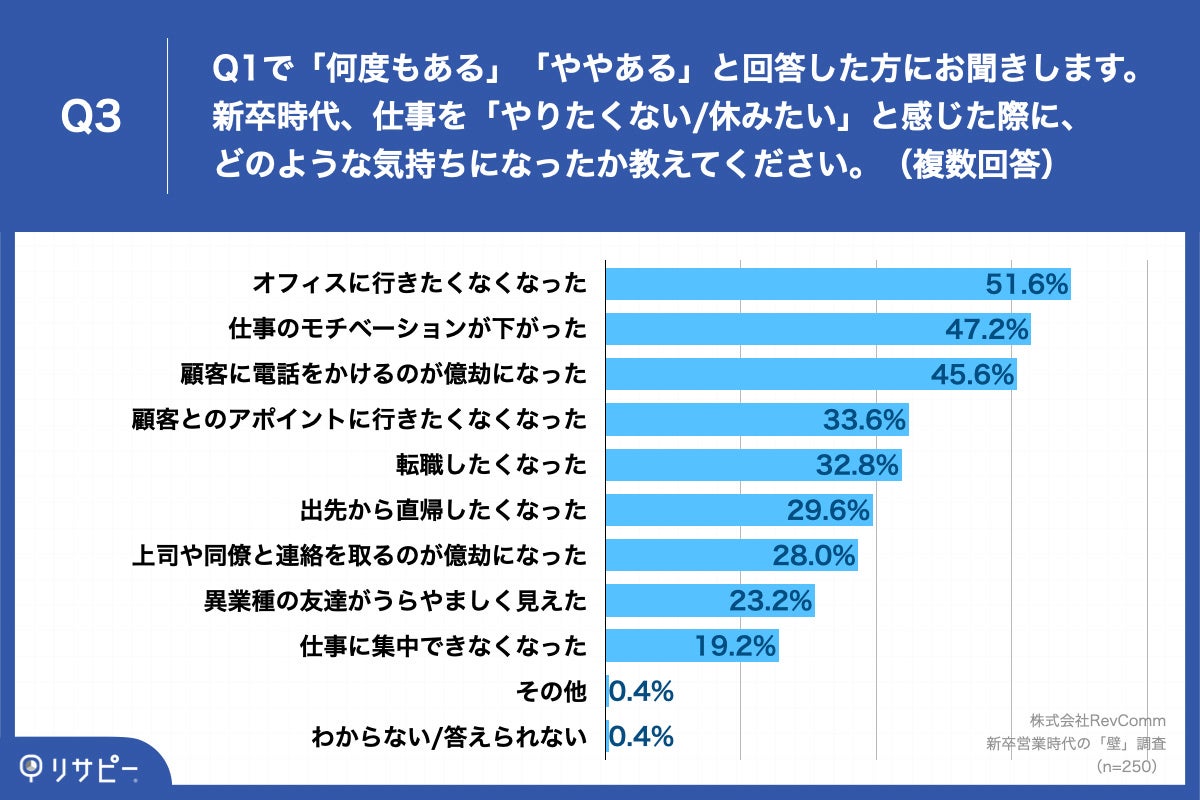 - 新卒時代、仕事を「やりたくない」と感じた際、半数以上が「オフィスに行きたくなくなった」と回答