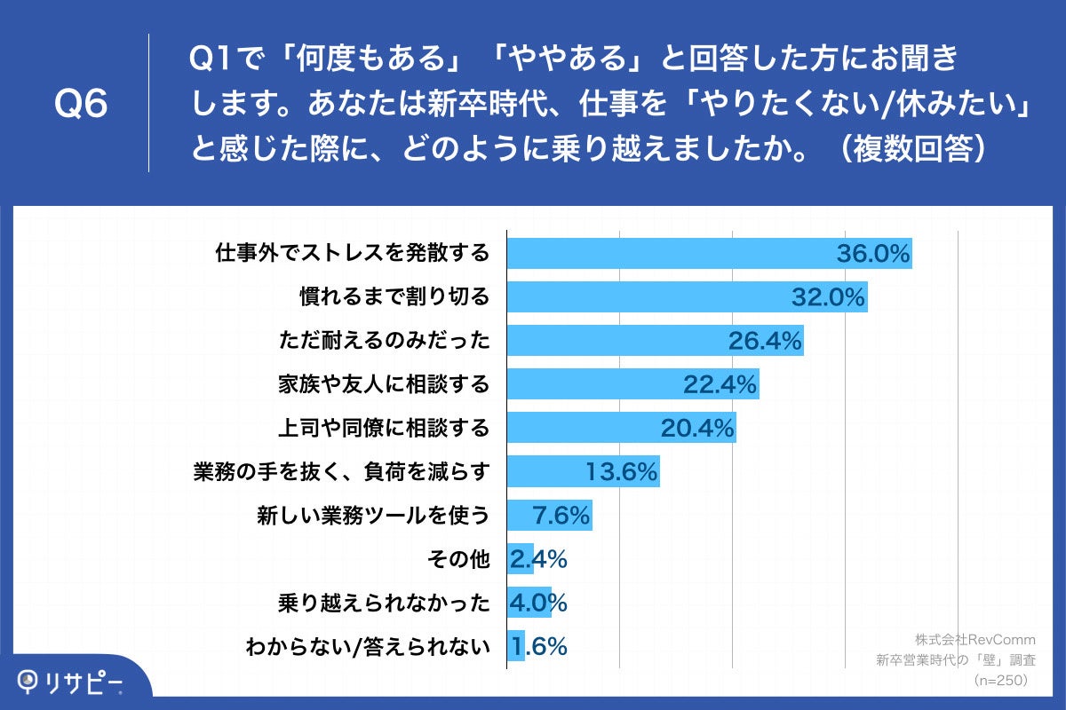 - 乗り越える方法は、「仕事外でストレスを発散する」や「慣れるまで割り切る」など