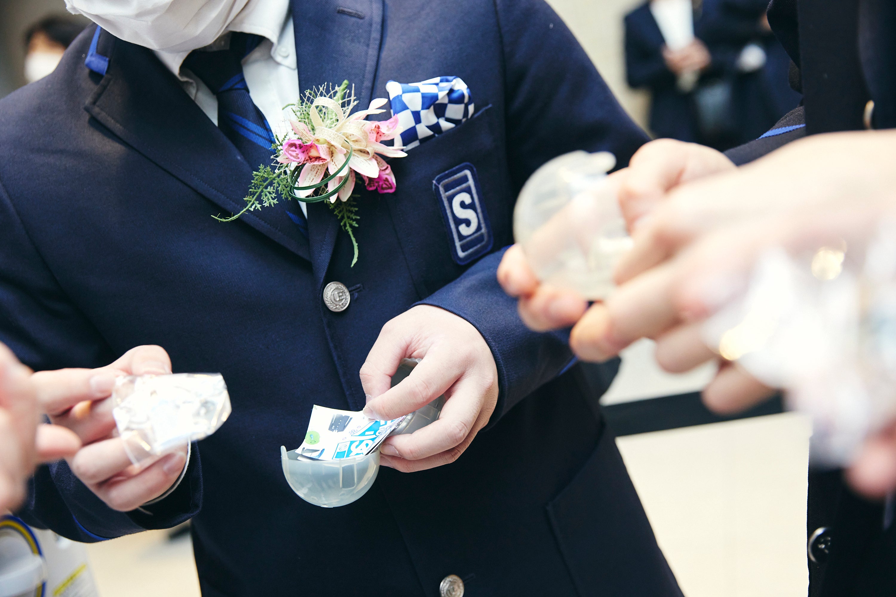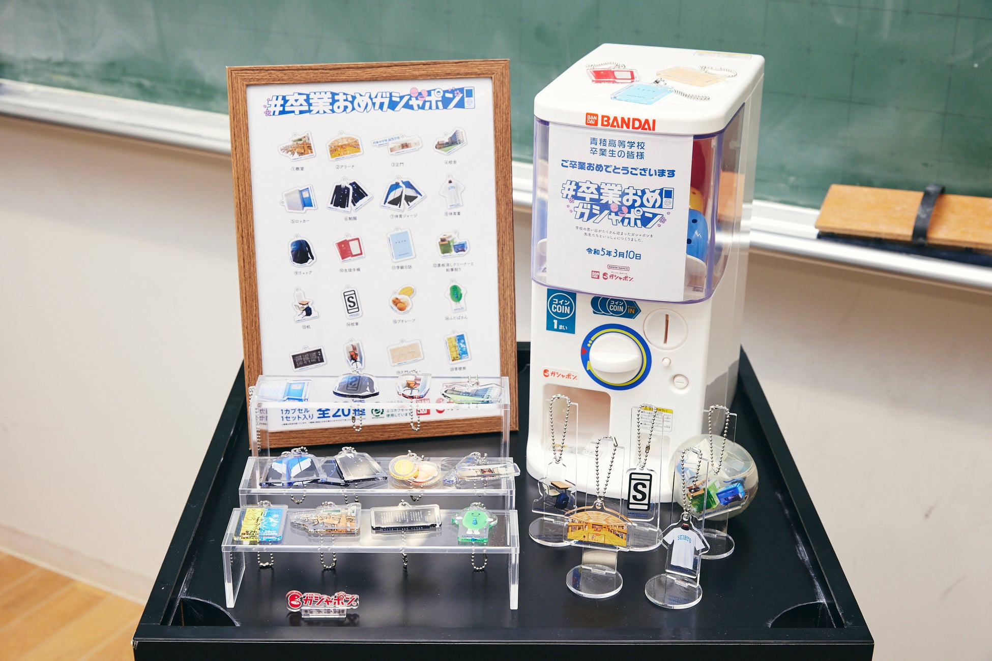 本企画では、卒業生273名のために、青稜高等学校の校舎や制服、生徒手帳、近隣のパン屋など、高校生活の思い出が詰まったオリジナルアクリルチャーム(全20種)を制作。卒業式当日、最後のホームルームの時間中、校舎内に約100面のガシャポンマシンをサプライズで設置し、卒業生の皆さんにこの日限定の特別なガシャポンをプレゼントしました。