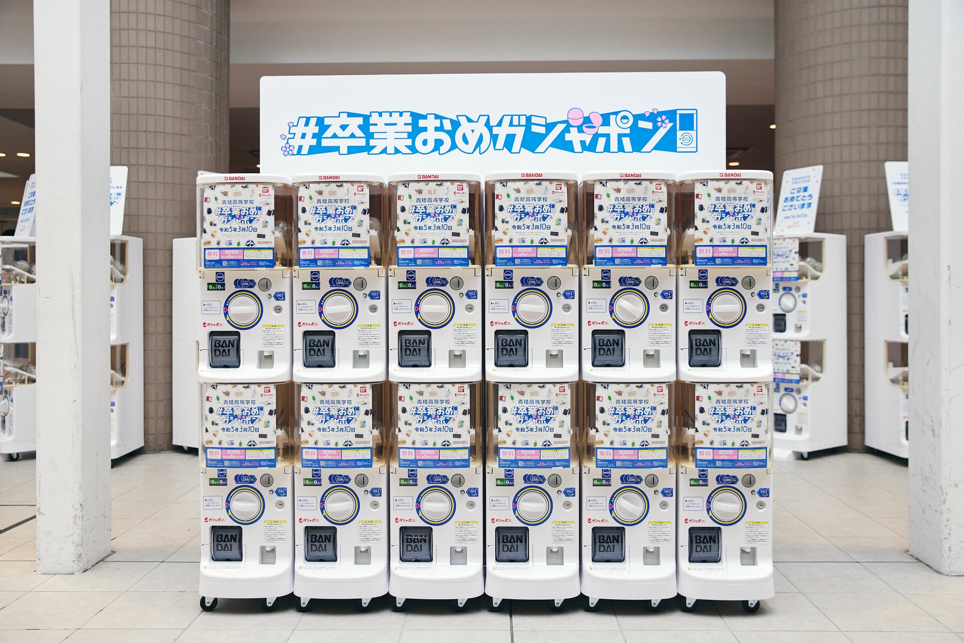 \コロナ禍で3年間を過ごした卒業生にサプライズ!/サプライズイベント「#卒業おめガシャポン」を実施卒業式当日、約100面のガシャポンマシンが学校に出現!